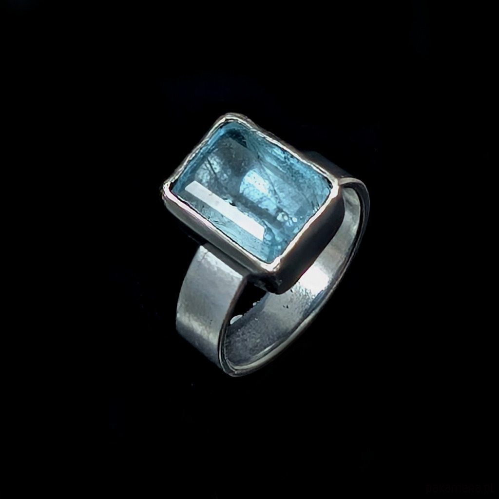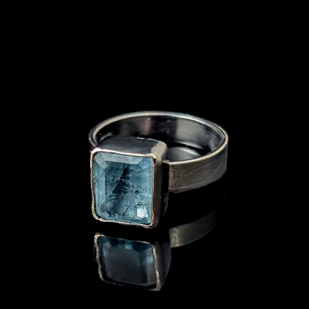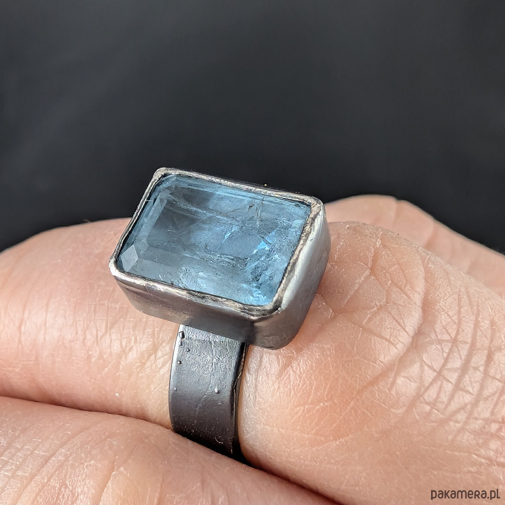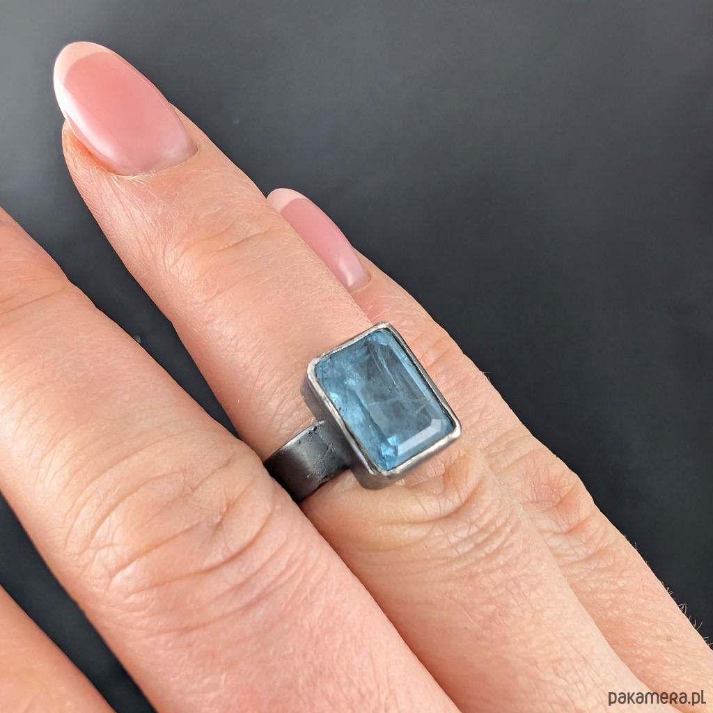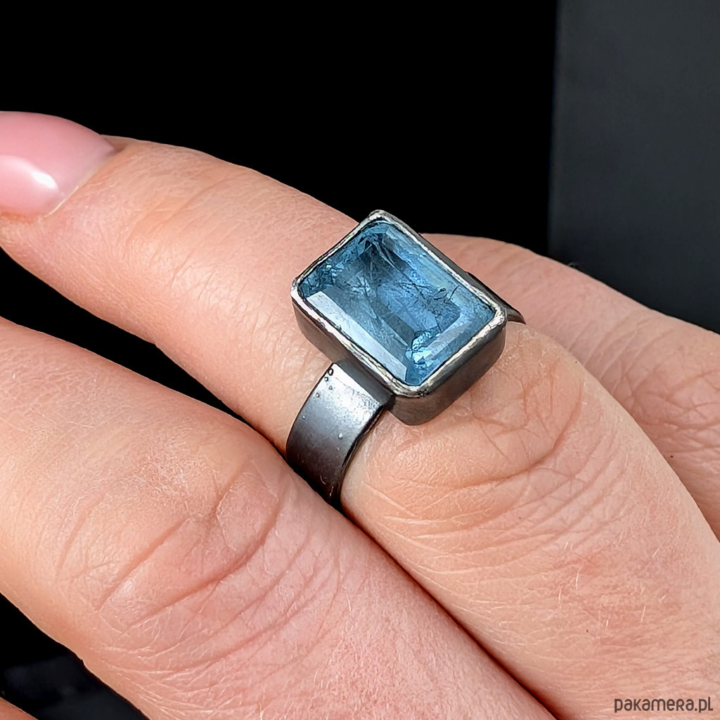 Pierścionek z oprawionym w srebro pr.925 przepięknym, świetlistym akwamarynem. Kolor niesamowity! Fasetowana tafla. Oprawa 12 x 9 mm, rozmiar jubilerski 13 mogę powiększyć do max rozmiaru 14. Proszę napisać na jaki rozmiar dopasować. Obrączka o szerokości 4 mm. Waga 4,9 grama. Pierścień zostanie zapakowany w ozdobne pudełeczko.