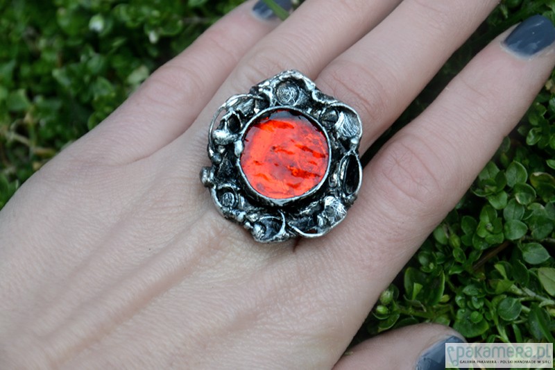 Duży, dekoracyjny przyciągający spojrzenia pierścionek ze szkłem w pięknym kolorze. Średnica szkła wraz ze stylizowaną na stare srebro oprawą to ok. 3 cm. Obrączka regulowana. Biżuteria w 100% wykonana ręcznie, poszczególne sztuki mogą się minimalnie różnić.