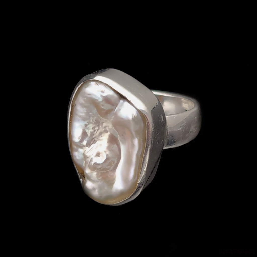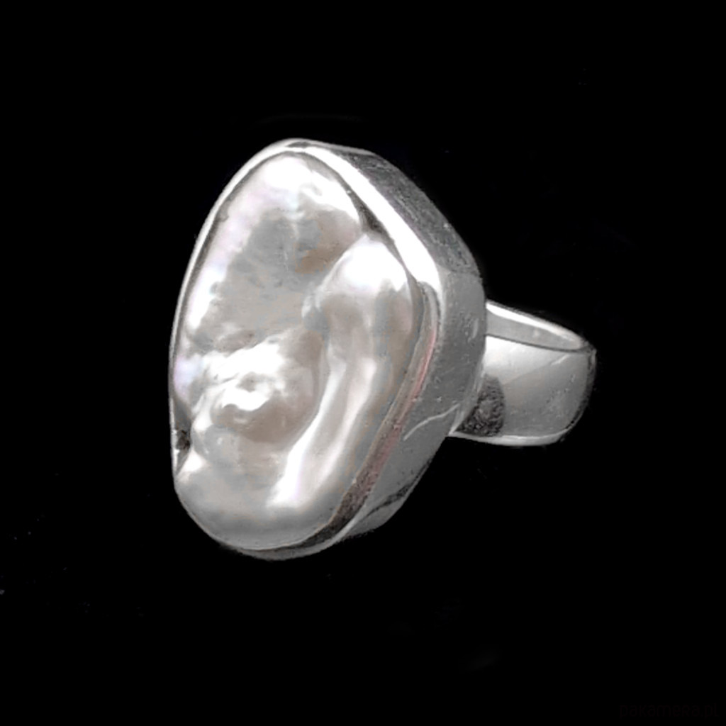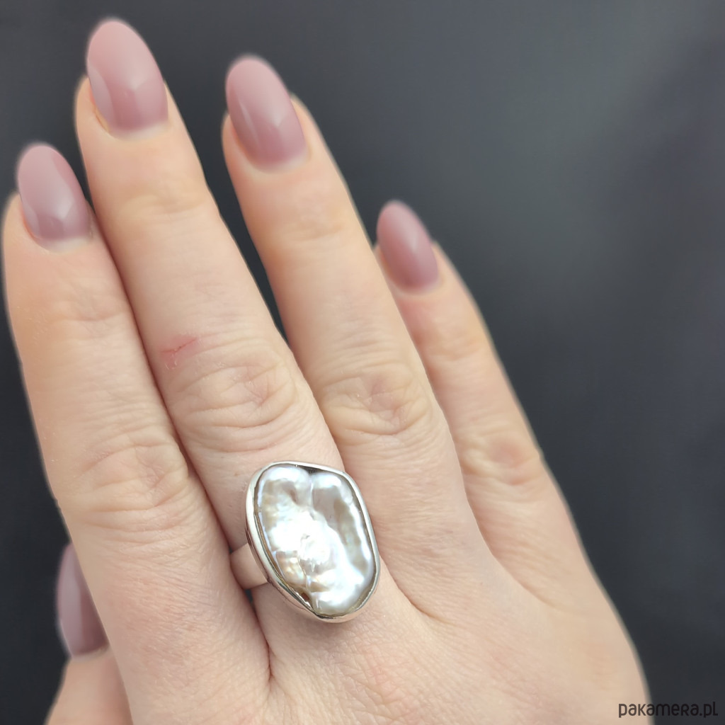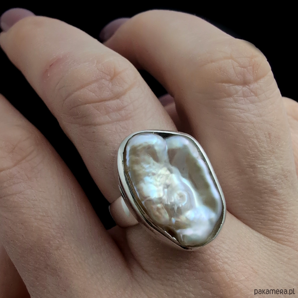 Pierścień wykonany ze srebra próby 925 z oprawioną okazałą, naturalną perłą. Ponadczasowa elegancja, klasyka z nutą awangardy. Przepiękny. Wymiary 23 x 16 mm, waga pierścienia 9,6 g. Rozmiar jubilerski 16, mogę powiększyć na max 17. Szerokość obrączki to 6 mm. Wykonany przez dostawcę kamieni.