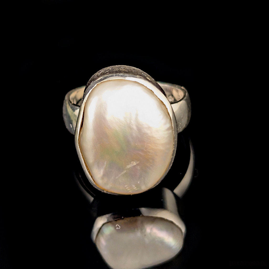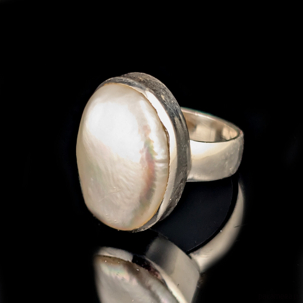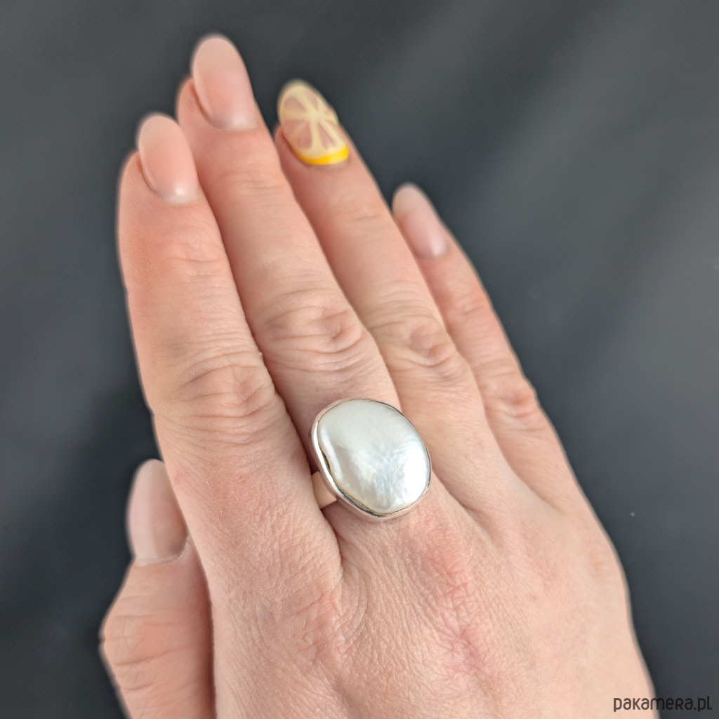Pierścień wykonany ze srebra próby 925 z oprawioną okazałą, piękną naturalną perłą. Ponadczasowa elegancja, klasyka z nutą awangardy. Wymiary 21 x 17 mm, waga pierścienia 11 g. Rozmiar jubilerski 21, mogę powiększyć na max 22. Szerokość obrączki to 6 mm. Wykonany przez dostawcę kamieni.