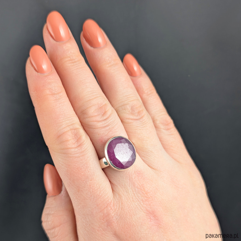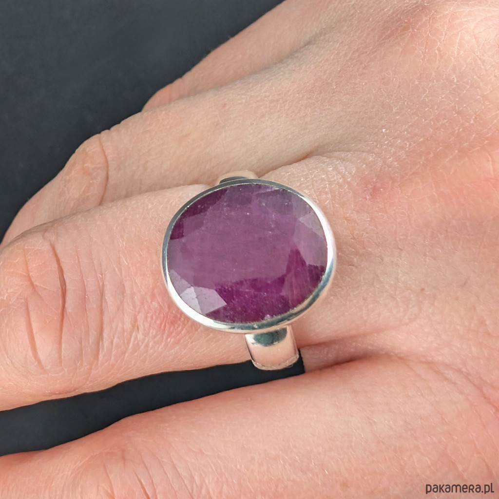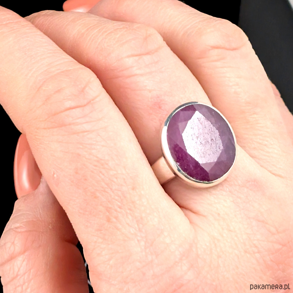 Pierścień z oprawionym w srebro próby 925 fasetowanym rubinem o pięknej barwie. Wymiary oprawy kamienia 18 x 15 mm. Rozmiar jubilerski regulowany w wąskim zakresie 16-20. Proszę napisać na jaki dopasować. Waga 7,6 grama. Szeroka obrączka ma 5 mm. Pierścień zapakowany zostanie w ozdobne pudełeczko.
