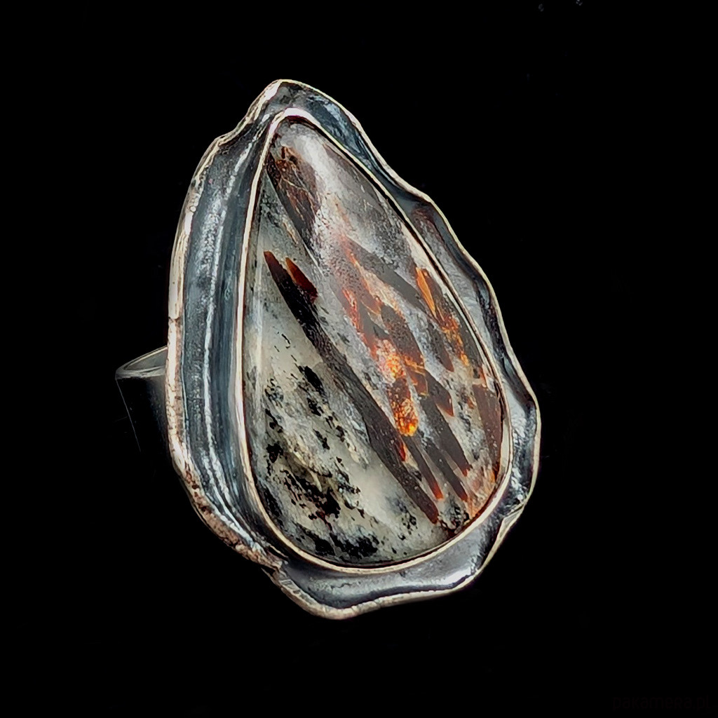 Zjawiskowy astrofilit oprawiony w srebro pr. 925, oksydowane. Waga 13 gramów. Wymiary całej oprawy 34 x 24 mm. Rozmiar jubilerski 17, mogę powiększyć na max 18. Obrączka ma szerokość 6 mm. Powierzchnia kamienia o ciekawej strukturze, miejscami z płonącymi igłami minerałów w odcieniu złota oraz czerwieni. Niezwykłe zjawisko, nie do ukazania na zdjęciu.Piękna kompozycja kamienia skapanego w oksydowanym srebrze. Pierścień zostanie zapakowany w ozdobne pudełeczko.