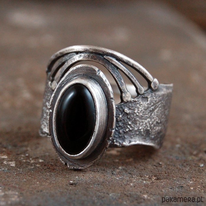 Pierścionek ze srebra i onyksu. Srebro oksydowane. Wielkość kamienia 0,6 - 1,2 cm, rozmiar regulowany. Przy zamówieniu proszę o podanie rozmiaru, pierścionek zostanie ustawiony.