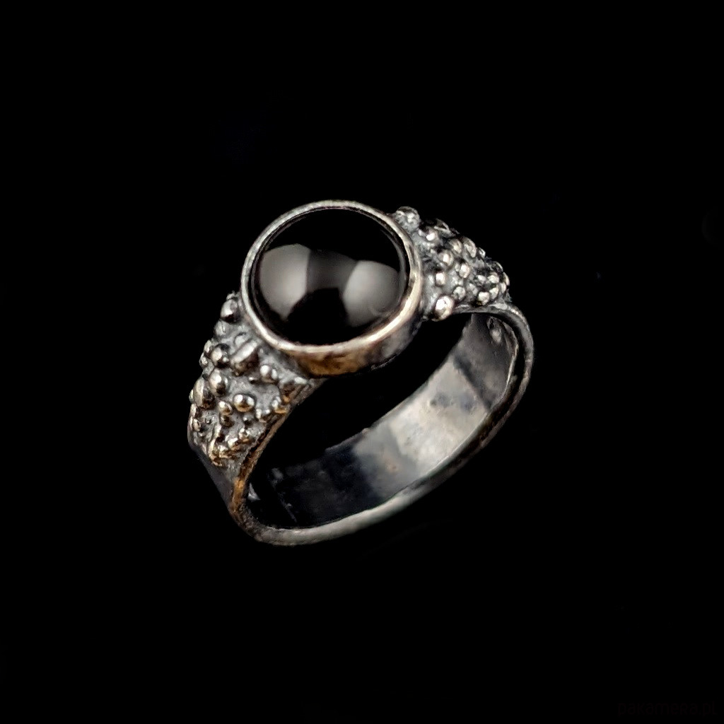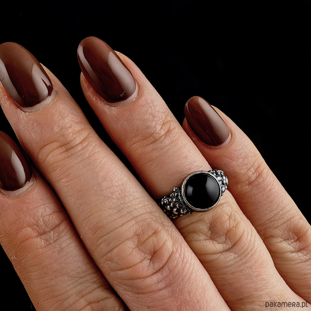 Pierścionek z oprawionym w srebro pr.925 onyksem o czarnej, eleganckiej tafli. Średnica oprawy kamienia 9 mm, rozmiar 11, mogę powiększyć obrączkę na max 12. Waga 5 g. Pierścień zapakowany w ozdobne pudełeczko.