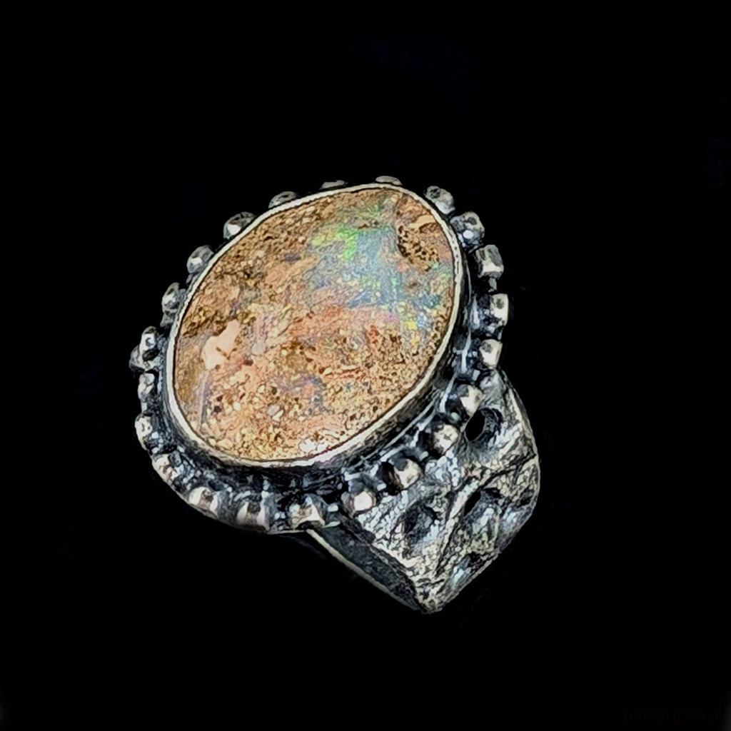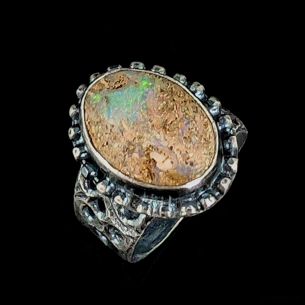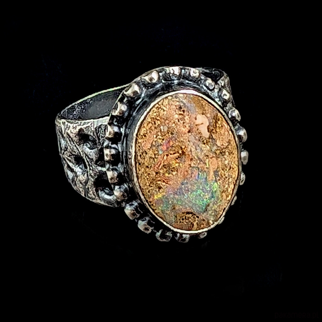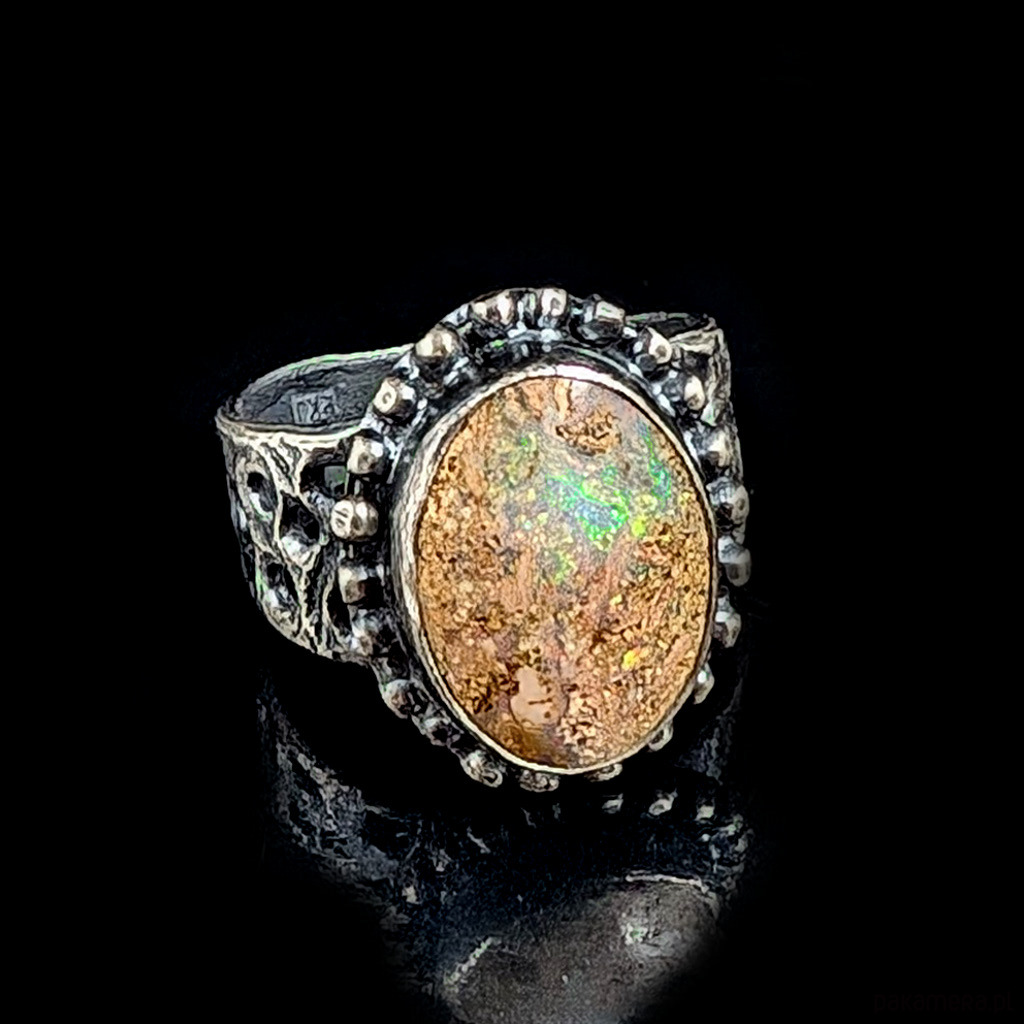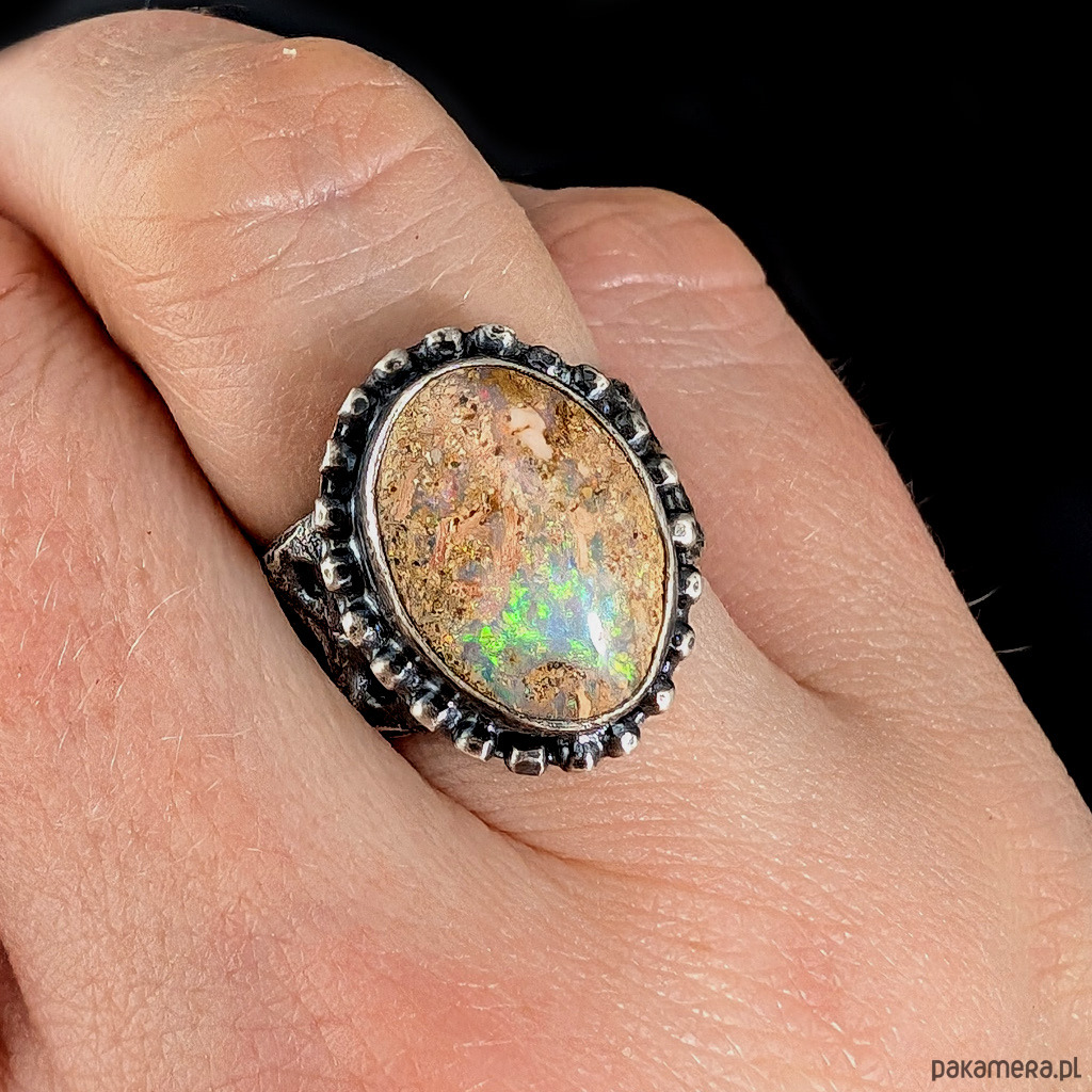 Oryginalny pierścień wykonany z oksydowanego srebra próby 925. Ażurową obrączkę (max 13 mm szerokości) zdobi wyjątkowy okaz opalu australijskiego boulder. Kamień ma oprawę 19 x 15 mm. Pierścionek w rozmiarze jubilerskim 15, mogę powiększyć do max 16, dopasuję po zakupie. waga 7,15 grama. Zostanie wysłany w ozdobne pudełeczko.