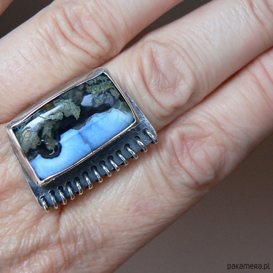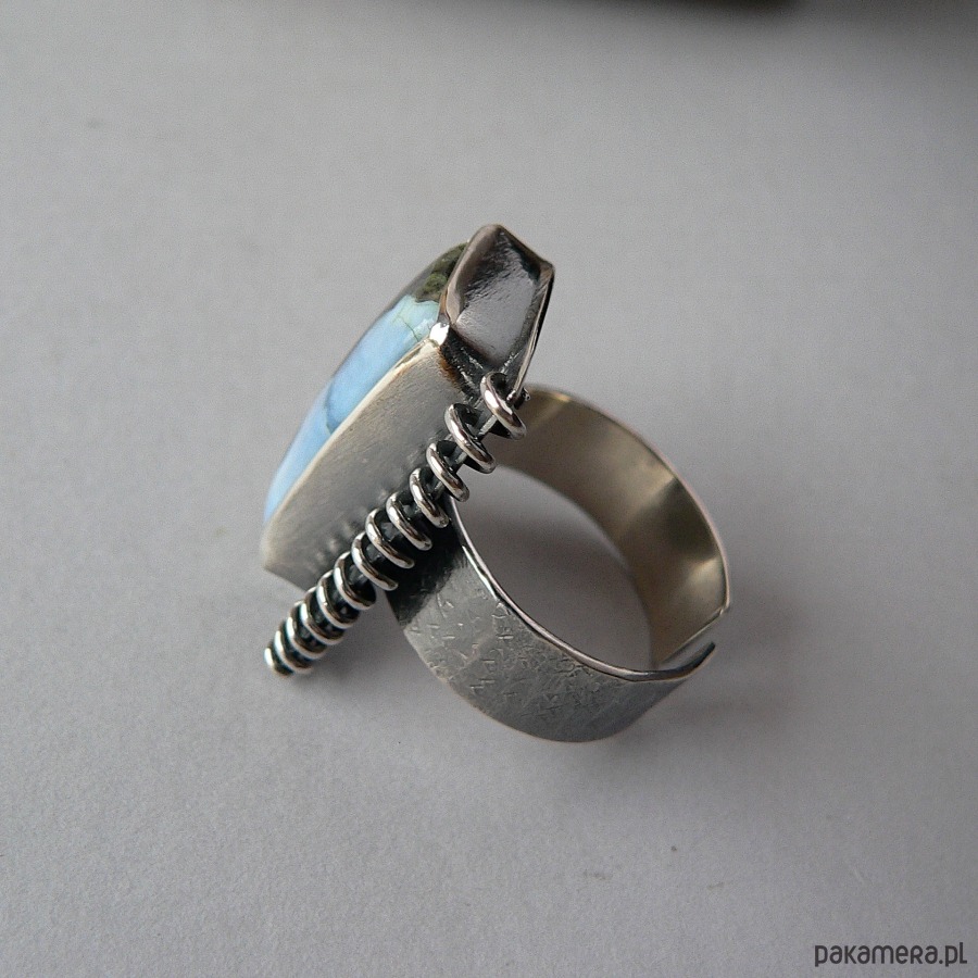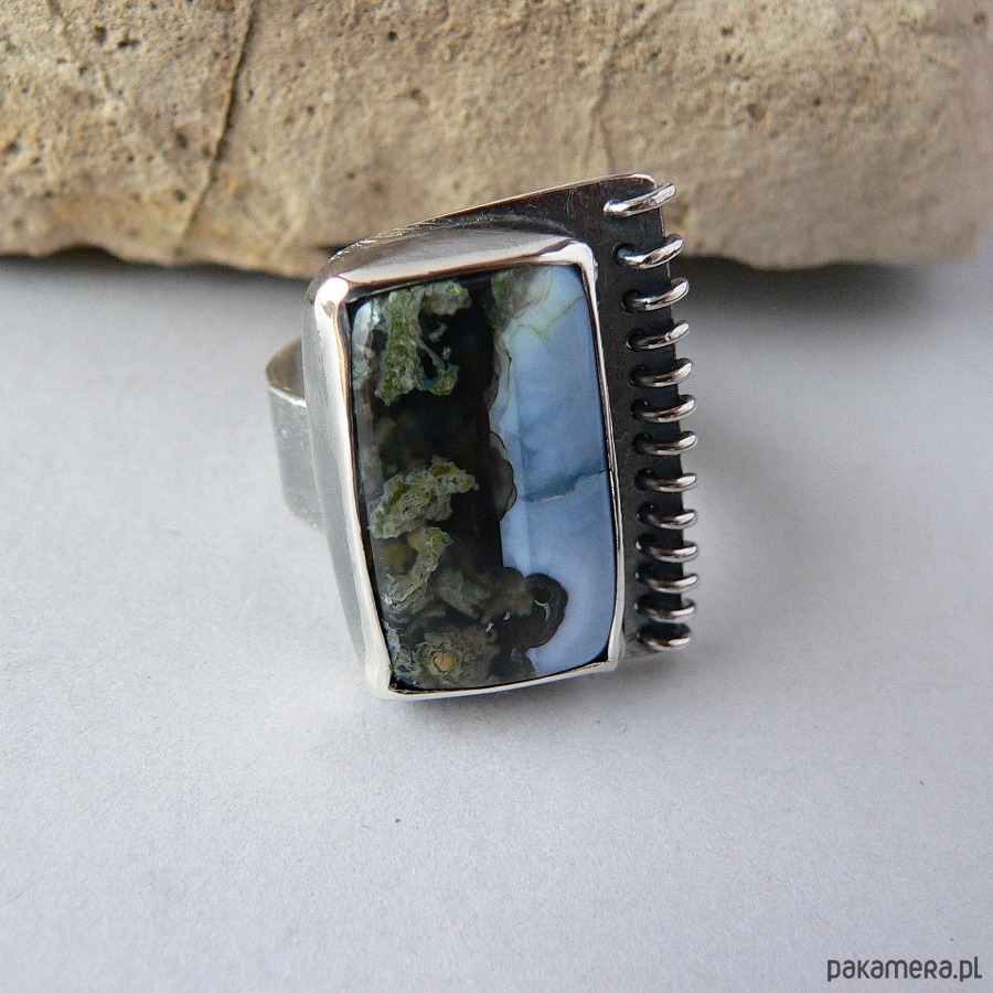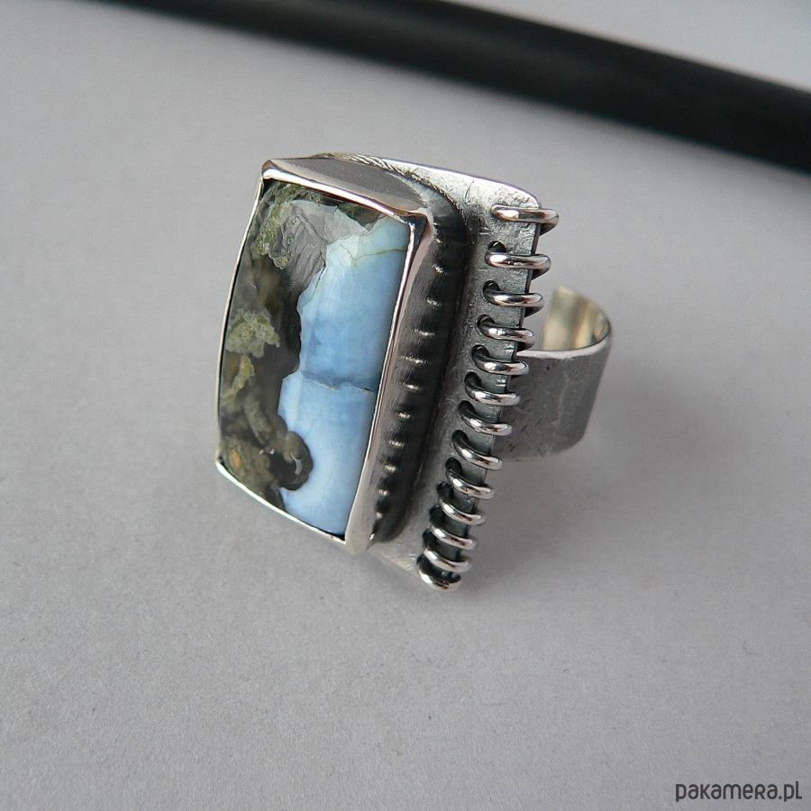 Pierścień wykonany z niebieskiego opala i srebra. Srebro kute, o surowym charakterze wykończone błyszczącym obszyciem. Całość oksydowana, detale polerowane. Wymiary frontu pierścienia 3/2 cm, opal - 2,4/1,5 cm Rozmiar regulowany, przy zakupie proszę o podanie noszonego rozmiaru, ustawię obrączkę.