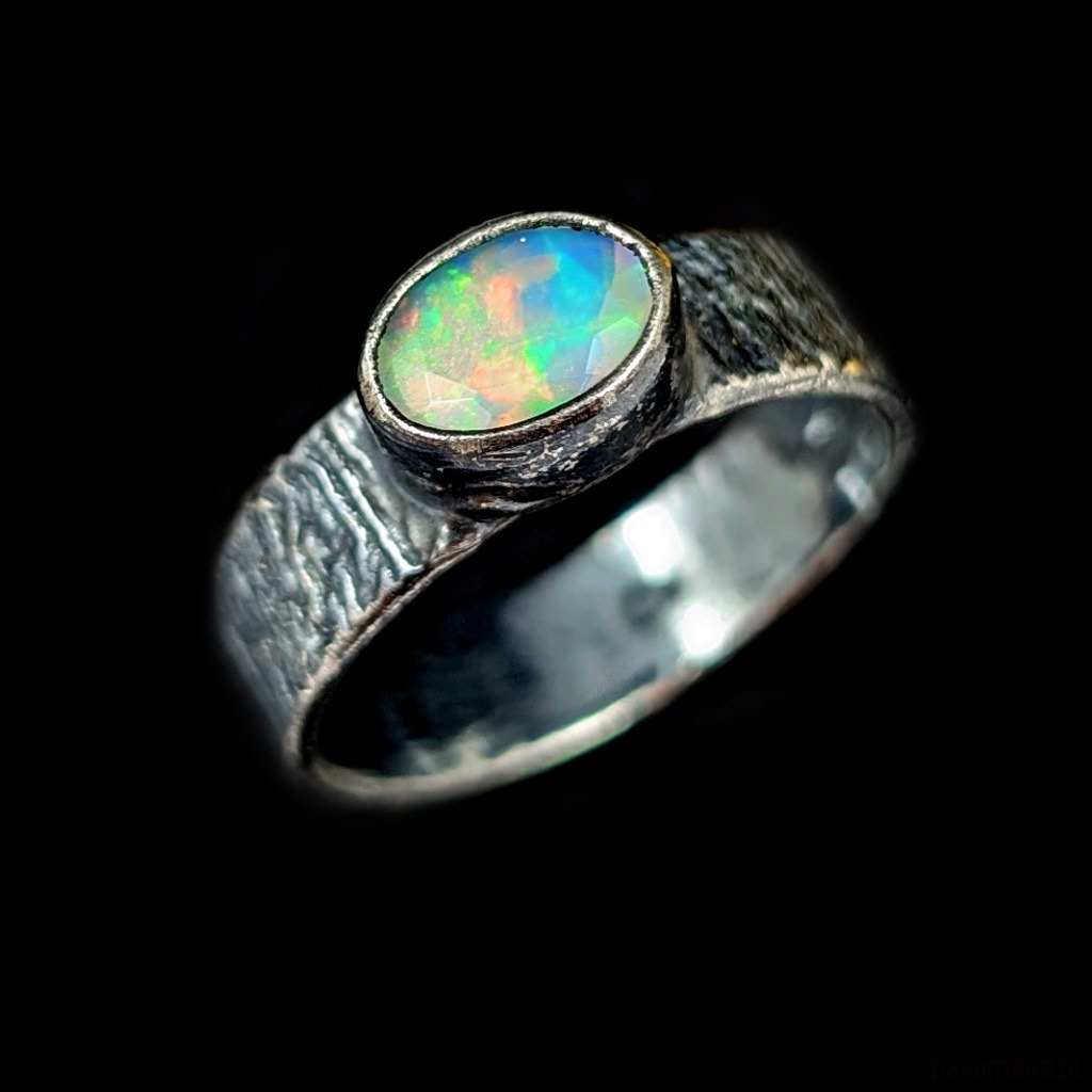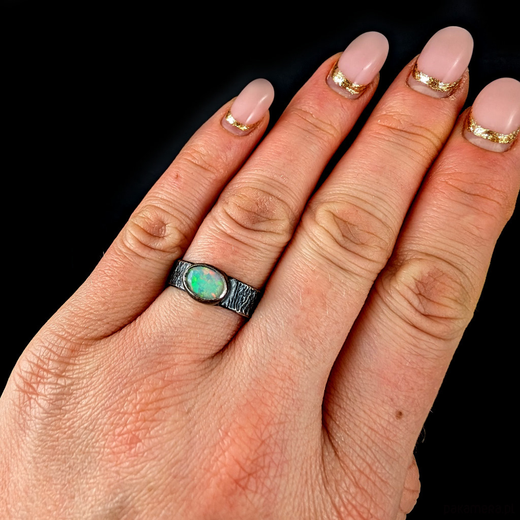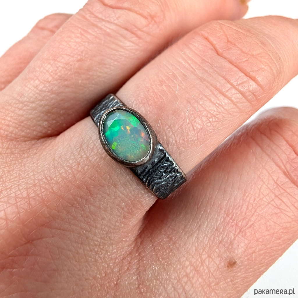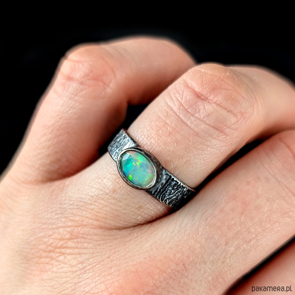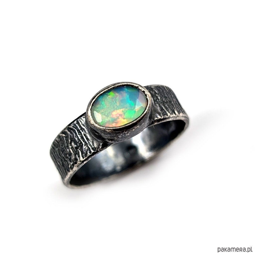 Oryginalny pierścionek z przepięknym opalem etiopskim. Rozmiar jubilerski 20, moge powiekszyc do 21, Obrączka ma 5 mm szerokości. Oprawa kamienia 9 x 7 mm. Waga 4,3 g. Można zamówić inne rozmiary z podobnym opalem. Pierścień zostanie zapakowany w ozdobne pudełeczko.