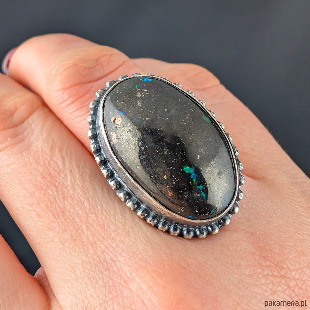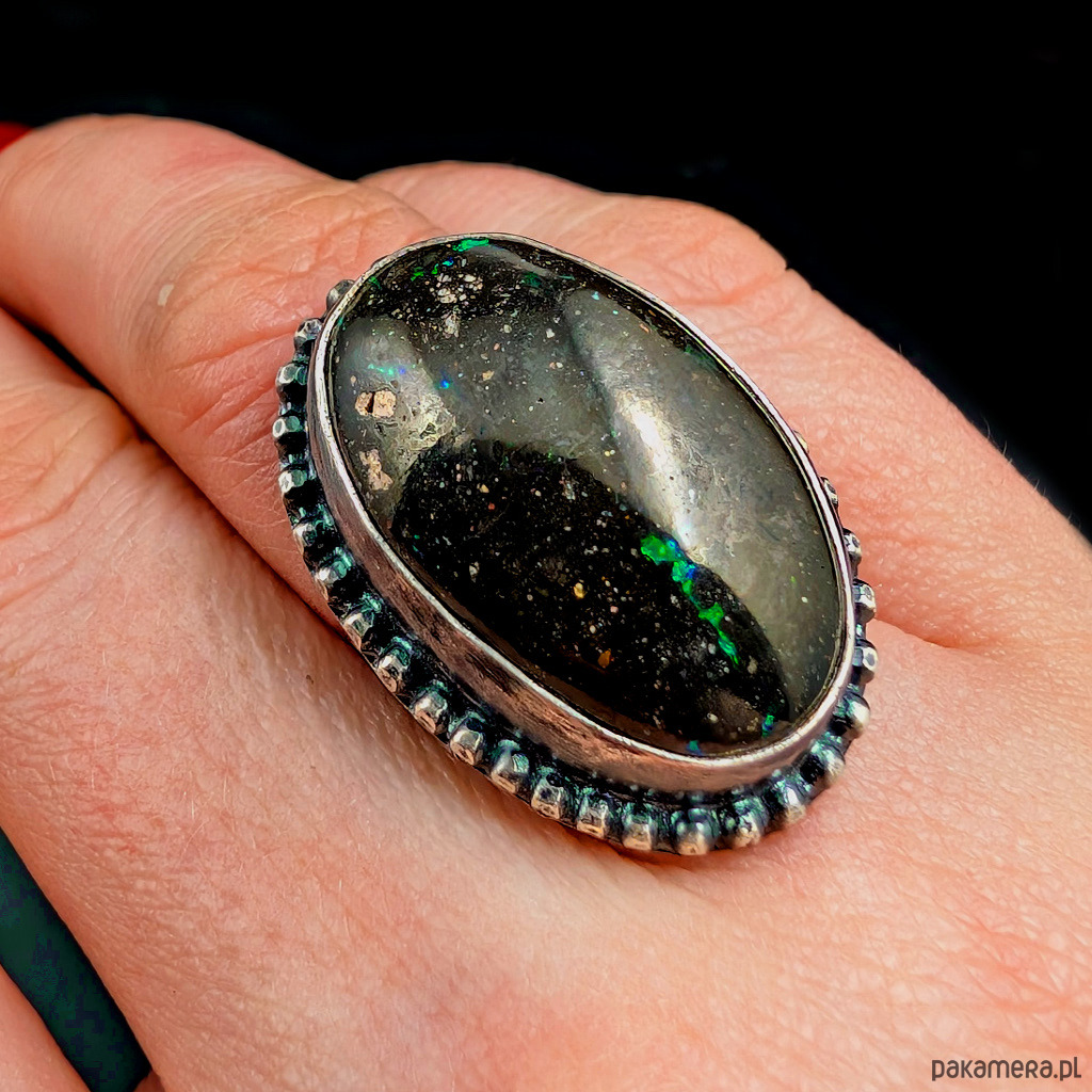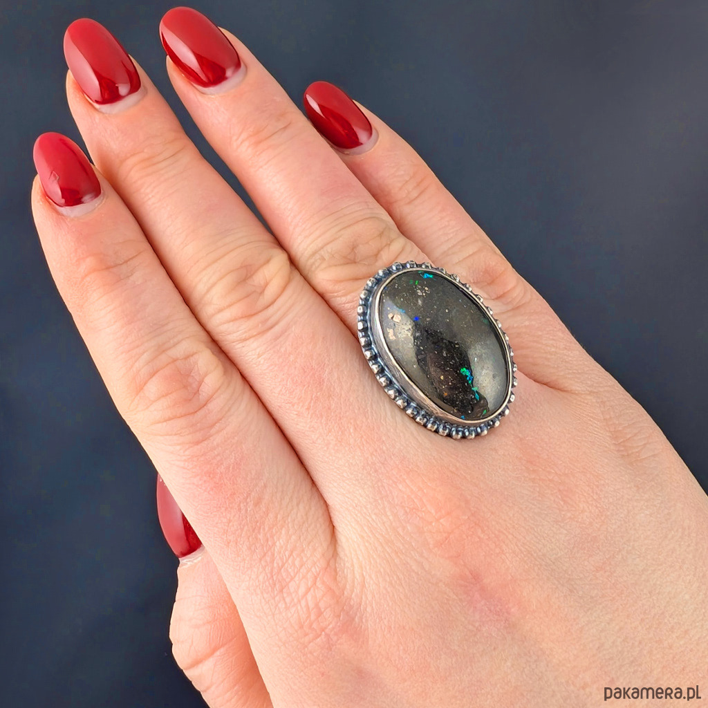 Piękny pierścień z oprawionym w srebro próby 925 naturalnym opalem australijskm. Wymiary całej oprawy 30 x 20 mm, rozmiar jubilerski 13, mogę dopasować w zakresie 13-18. Waga 12,7 g. Zostanie zapakowany w ozdobne pudełeczo.