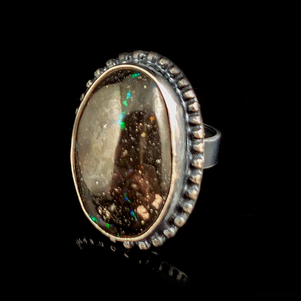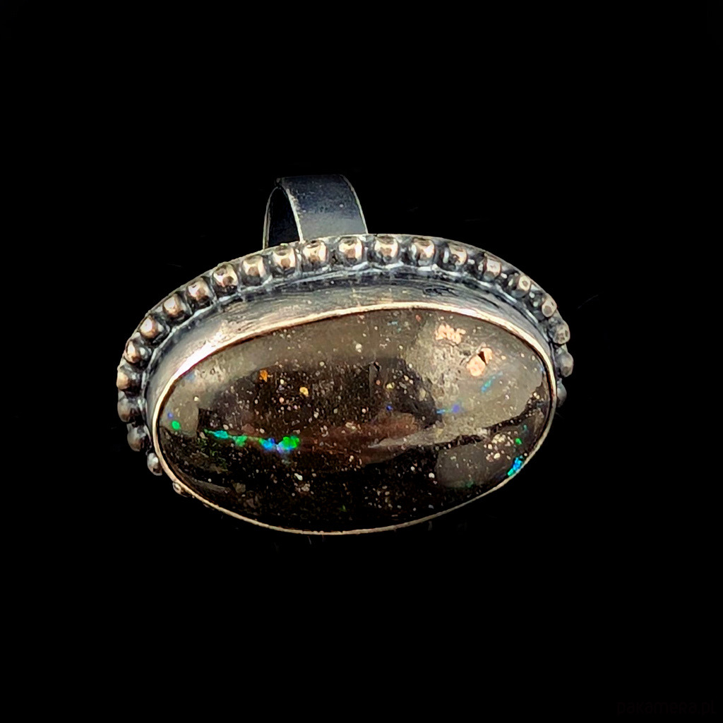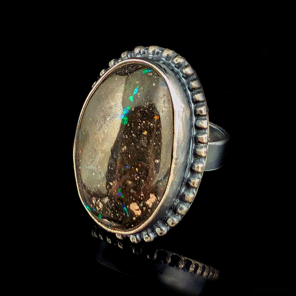 Piękny pierścień z oprawionym w srebro próby 925 naturalnym opalem australijskm. Wymiary całej oprawy 30 x 20 mm, rozmiar jubilerski 13, mogę dopasować w zakresie 13-18. Waga 12,7 g. Zostanie zapakowany w ozdobne pudełeczo.