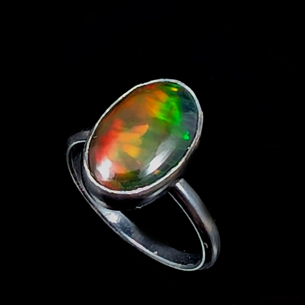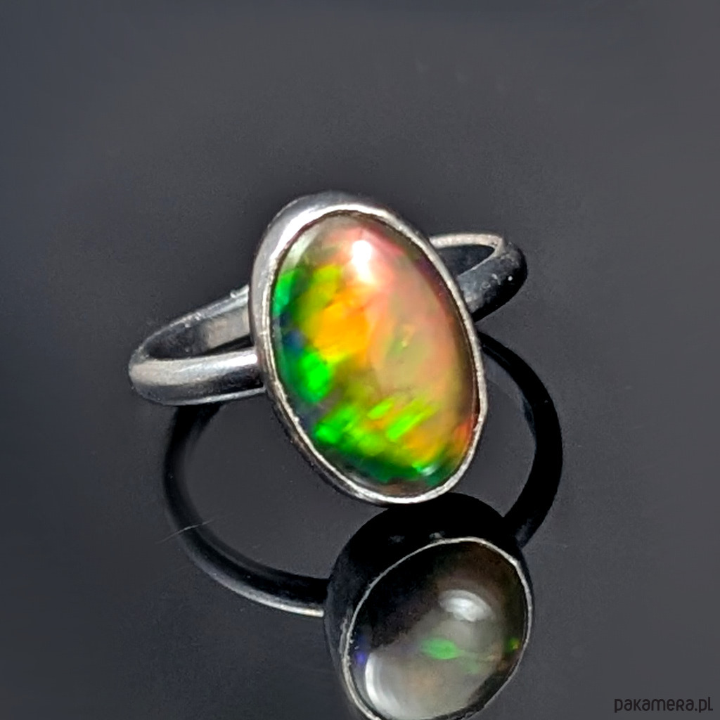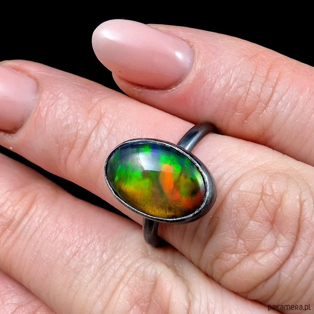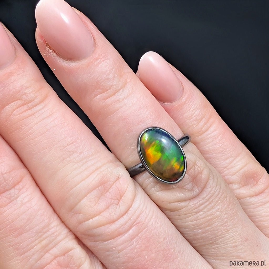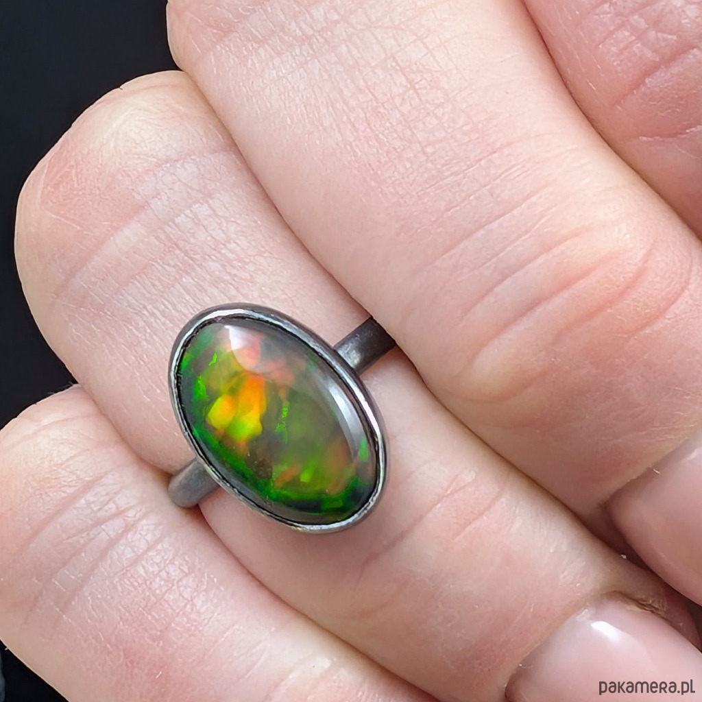 Pierścionek z przepięknym, bardzo kolorowym opalem etiopskim oprawionym w oksydowane srebro 925.
