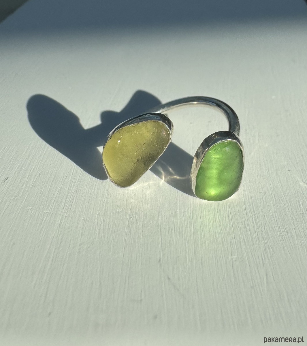 Unikalny, ręcznie wykonany pierścionek typu open ze srebra próby 925, zdobiony naturalnym szkłem morskim. Każdy egzemplarz to małe dzieło sztuki – niepowtarzalny kształt i odcień szkła sprawiają, że nie ma dwóch takich samych.