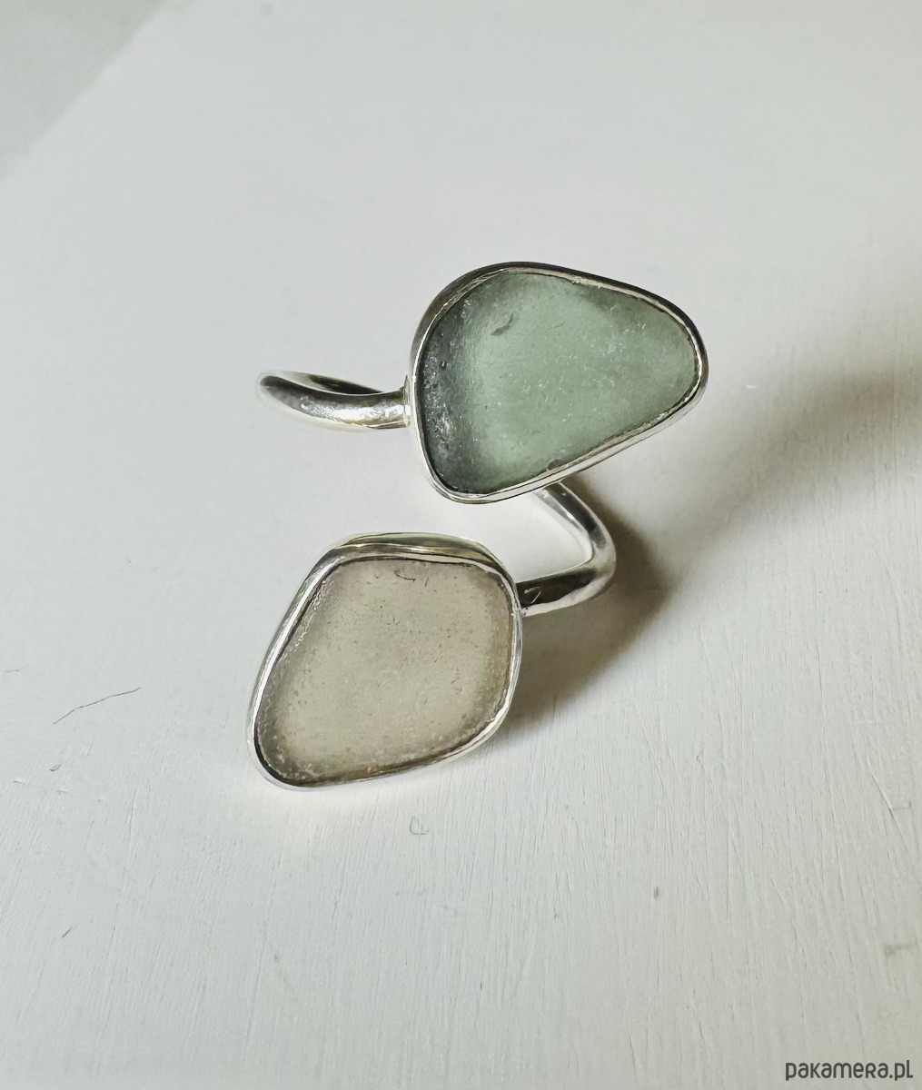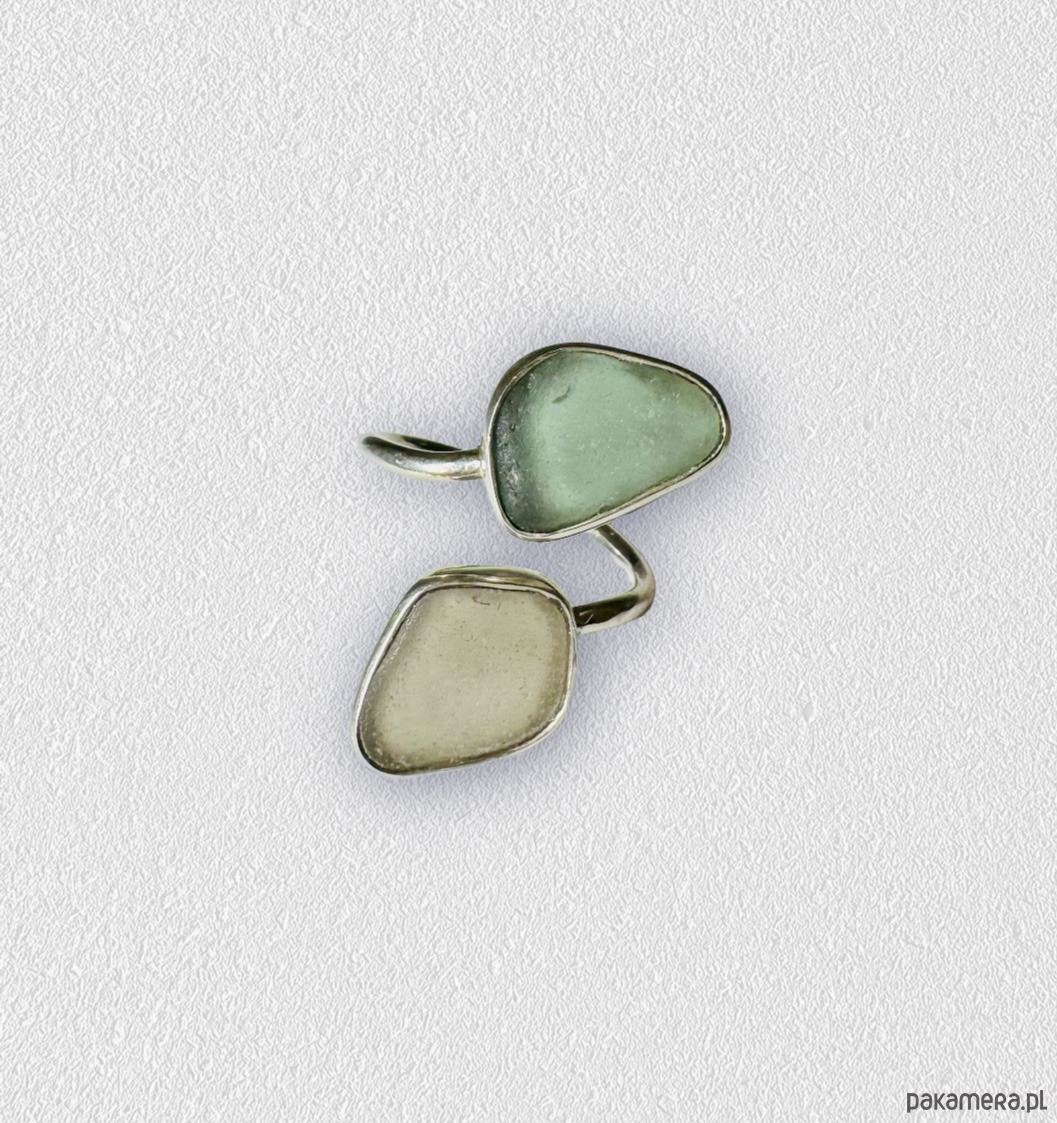 Unikalny, ręcznie wykonany pierścionek typu open ze srebra próby 925, zdobiony naturalnym szkłem morskim. Każdy egzemplarz to małe dzieło sztuki – niepowtarzalny kształt i odcień szkła sprawiają, że nie ma dwóch takich samych.