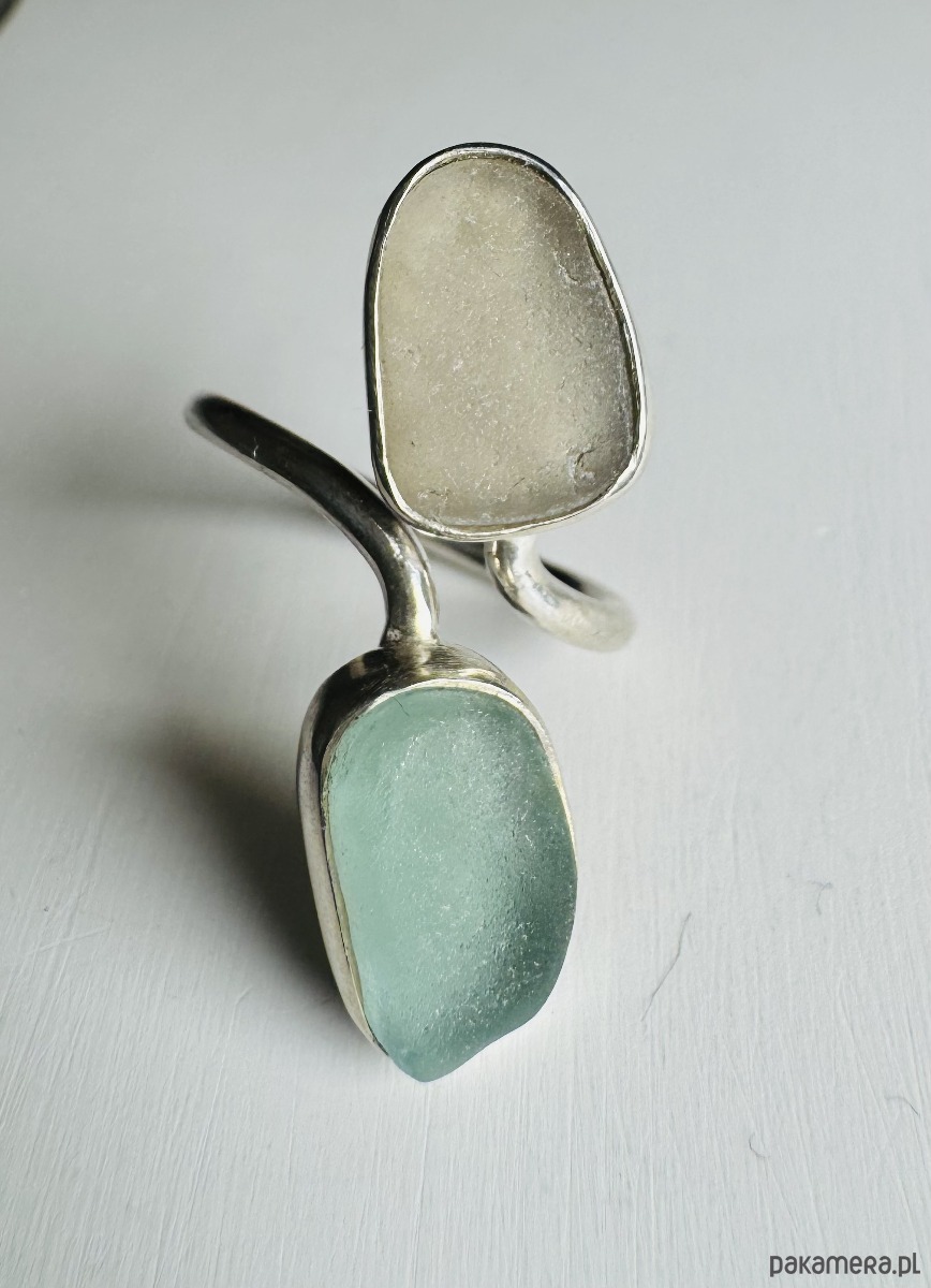 Unikalny, ręcznie wykonany pierścionek typu open ze srebra próby 925, zdobiony naturalnym szkłem morskim. Każdy egzemplarz to małe dzieło sztuki – niepowtarzalny kształt i odcień szkła sprawiają, że nie ma dwóch takich samych.