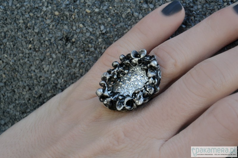 Efektowny, dekoracyjny przyciągający spojrzenia pierścionek ze szkłem. Wymiary szkła wraz ze stylizowaną na stare srebro oprawą wykonana z ekologicznej cyny to ok. 3 x 2 cm. Obrączka regulowana. Biżuteria w 100% wykonana ręcznie, poszczególne sztuki mogą się minimalnie różnić.