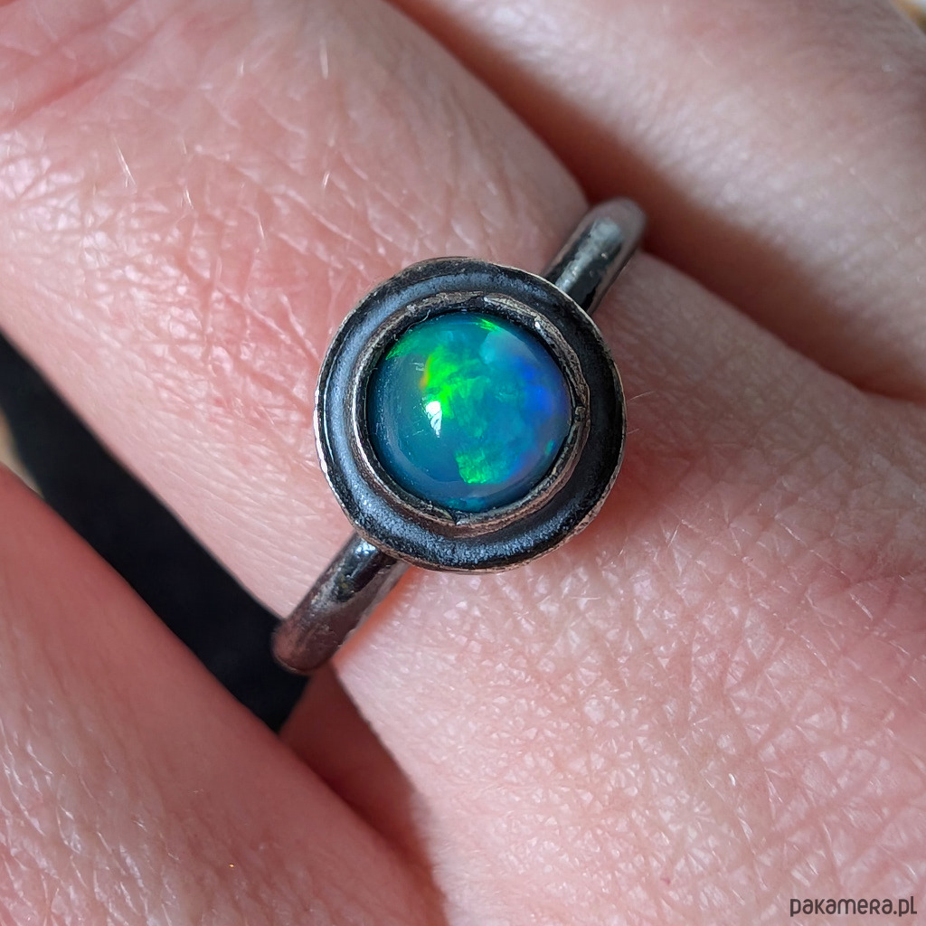 Pierścień z oprawionym opalem etiopskim o niebieskiej tafli z zieloną poświatą. Srebro pr.925, oksydowane. Srednica oprawy 9 mm. Waga 2,5 g. Rozmiar jubilerski 18. Obrączka ma 2 mm szerokości. Zapakowany w ozdobne pudełeczko.
