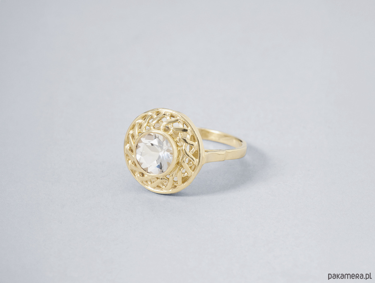 Pozłacany pierścionek z białym topazem. Kolekcja POWROTY to biżuteria stworzona ze starej biżuterii (tzw. upcykling). Powrót do klasyki, która jest ponadczasowa.