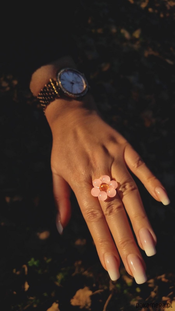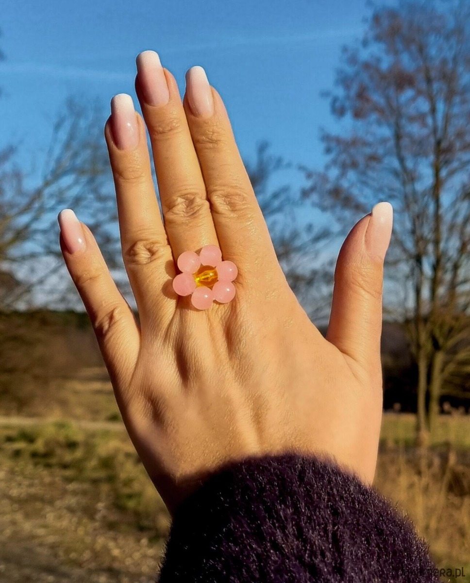 Pierścionek pastel pink, pierścionek z koralików, kwiat