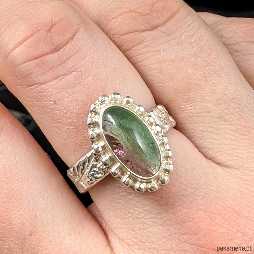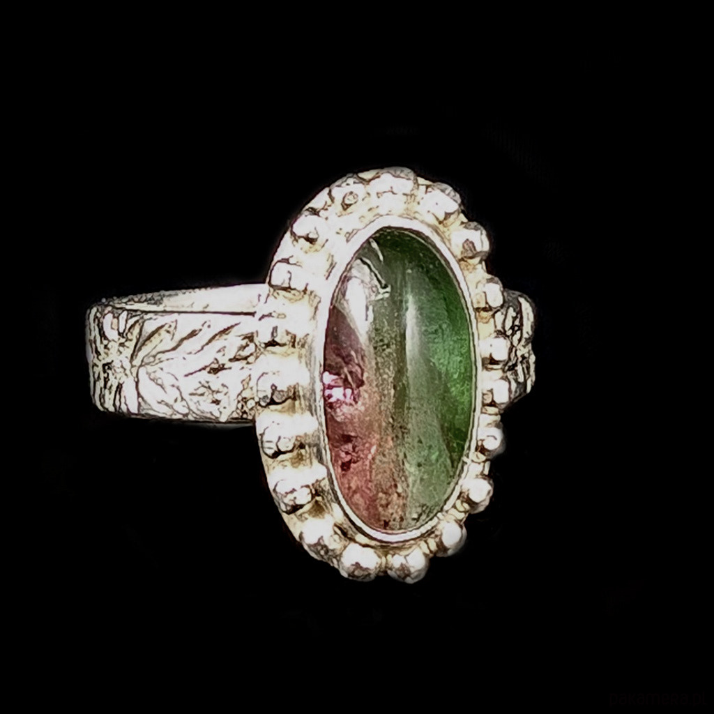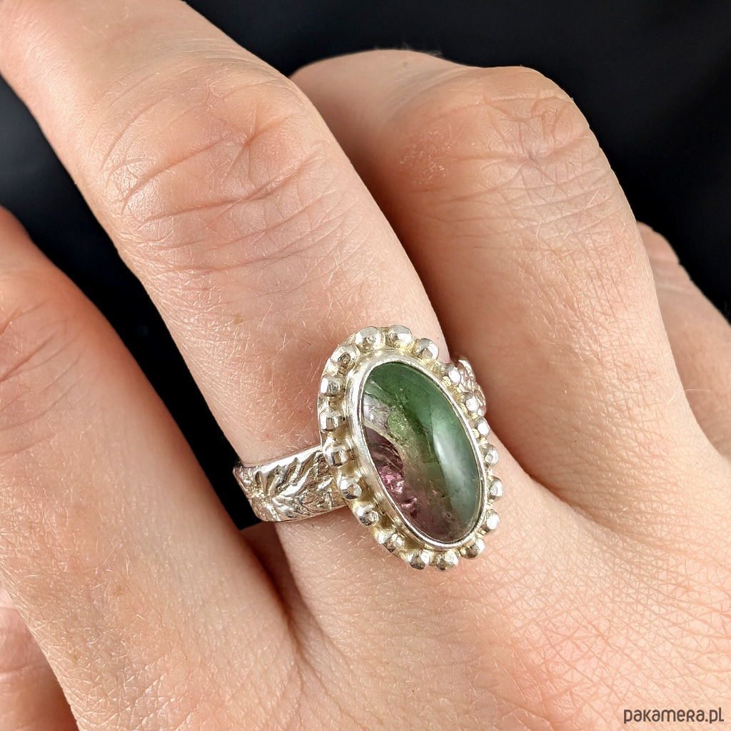 Pierścionek wykonany ze srebra próby 925 oraz naturalnego, przepięknego turmalinu arbuzowego. Bardzo interesujący i pożądany kamień w oprawie o wymiarach 20 x 121mm. Rozmiar jubilerski 17, mogę powiększyć obrączkę na rozmiar max. 18. Obrączka ma 5 mm szerokości. Waga 6 g. Pierścionek zostanie zapakowany w ozdobne pudełeczko