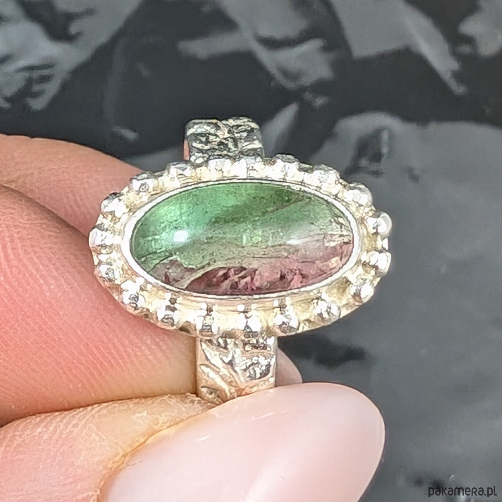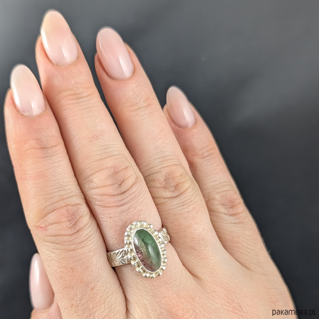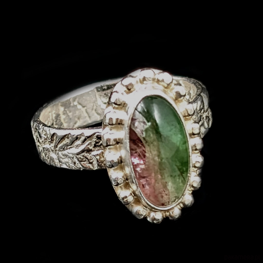 Pierścionek wykonany ze srebra próby 925 oraz naturalnego, przepięknego turmalinu arbuzowego. Bardzo interesujący i pożądany kamień w oprawie o wymiarach 20 x 121mm. Rozmiar jubilerski 17, mogę powiększyć obrączkę na rozmiar max. 18. Obrączka ma 5 mm szerokości. Waga 6 g. Pierścionek zostanie zapakowany w ozdobne pudełeczko
