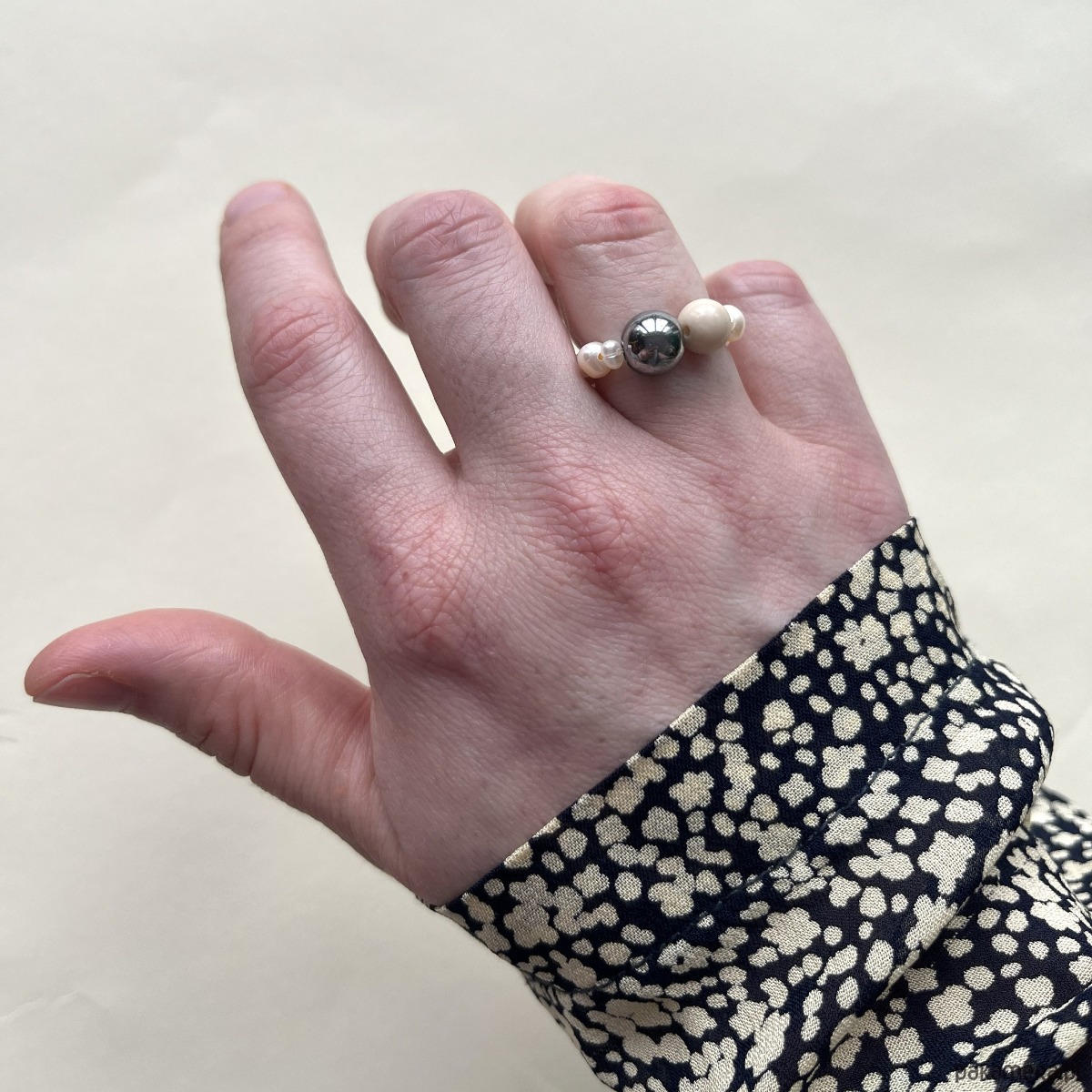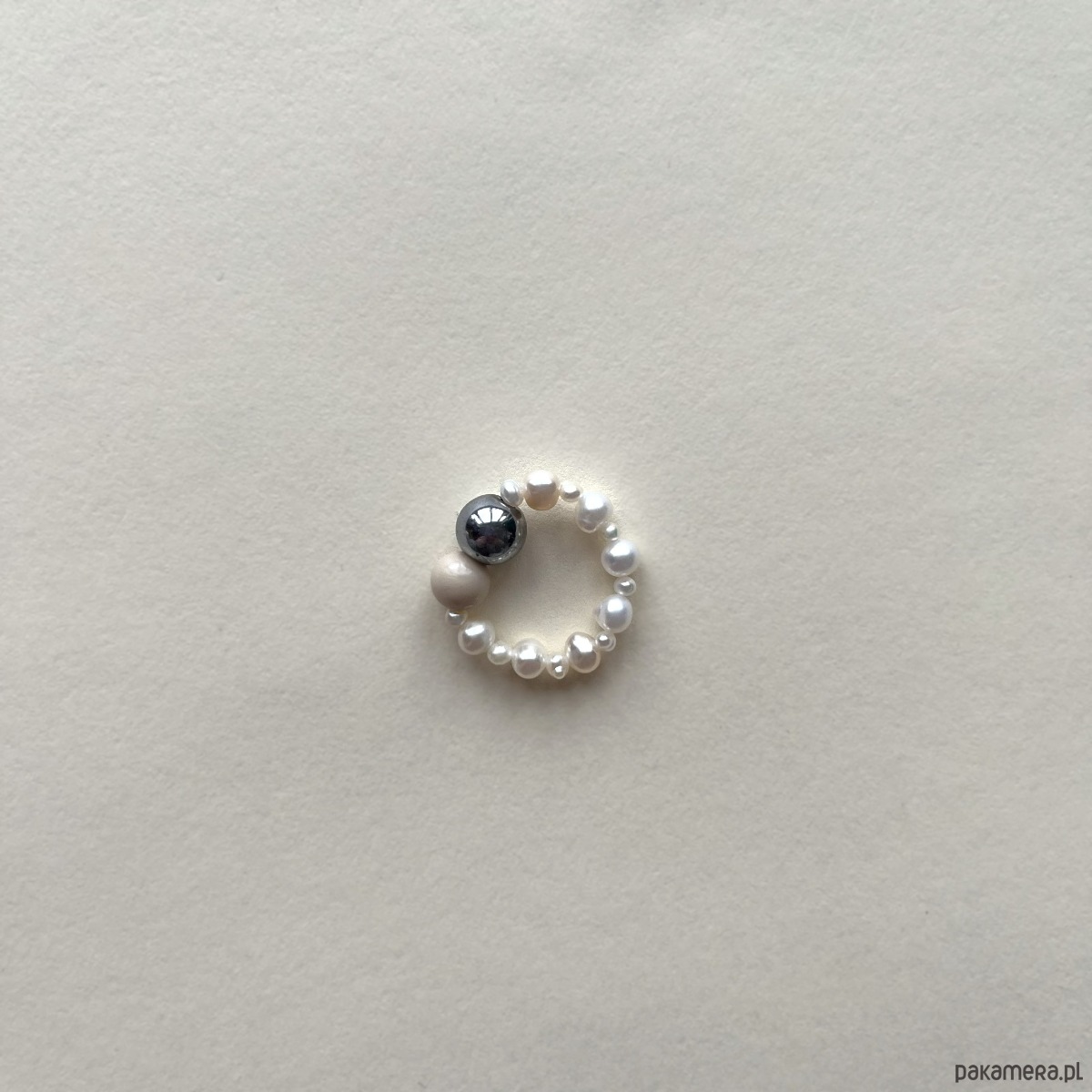 Minimalistyczny pierścionek z naturalnej perły i kulek z kamienia.