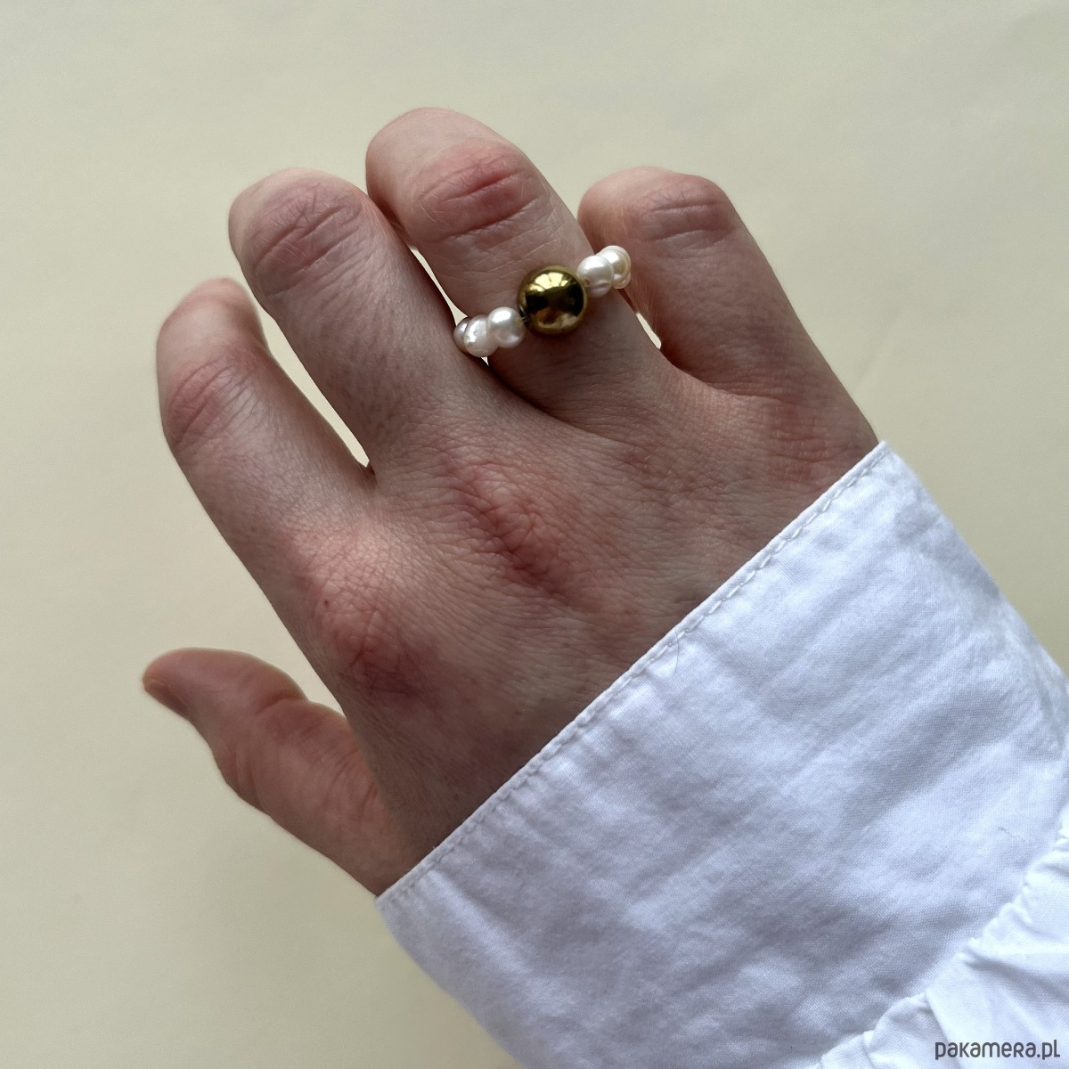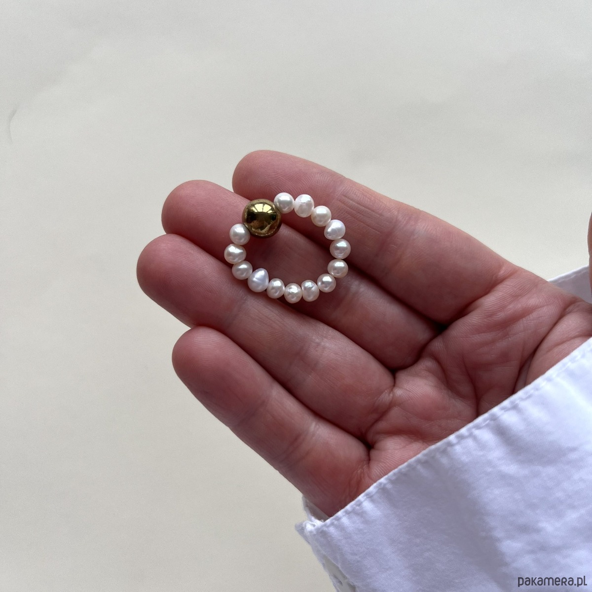 Minimalistyczny pierścionek z naturalnej perły i kulki z kamienia.
