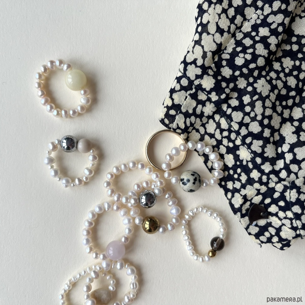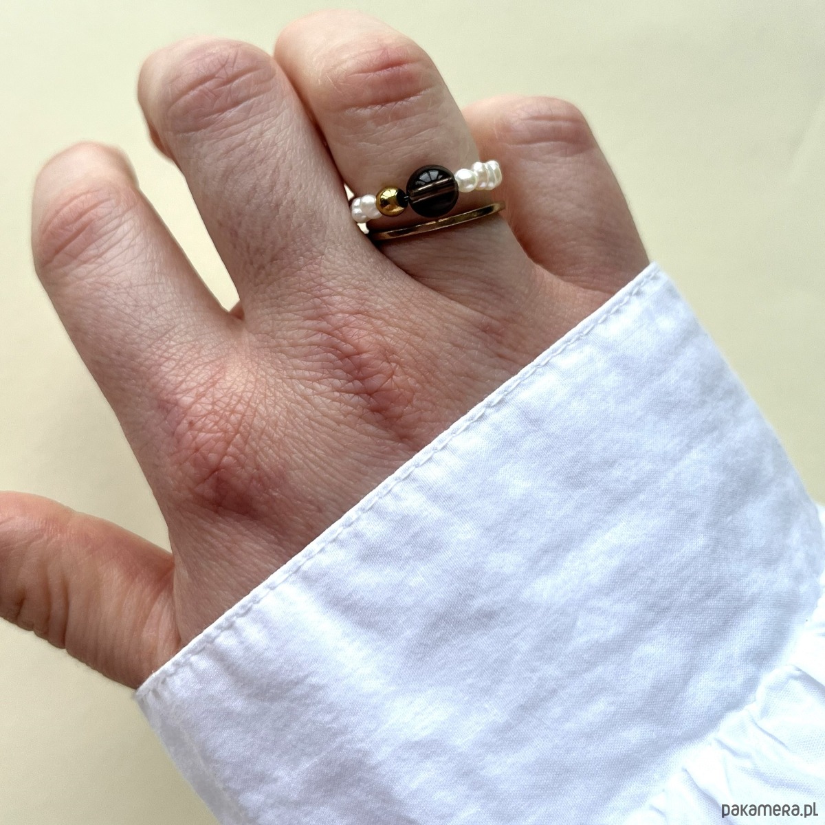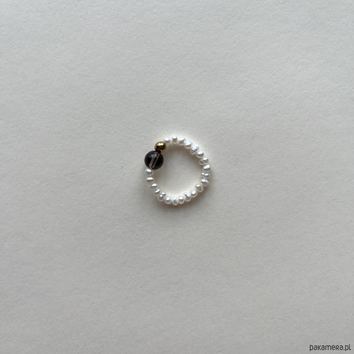 Minimalistyczny pierścionek z naturalnej perły i kulek z kamienia.