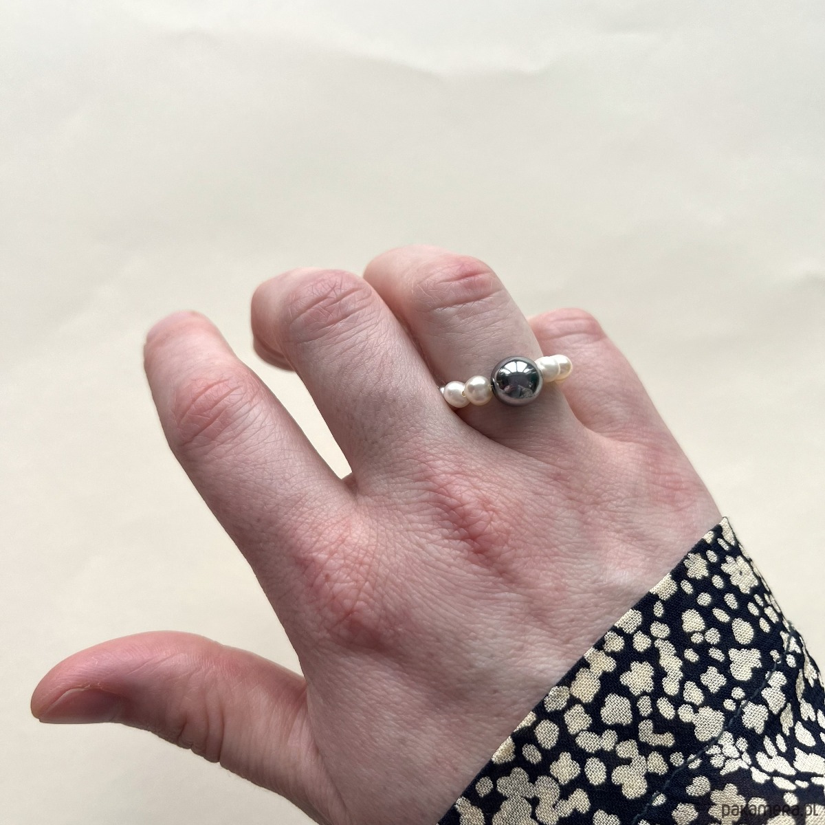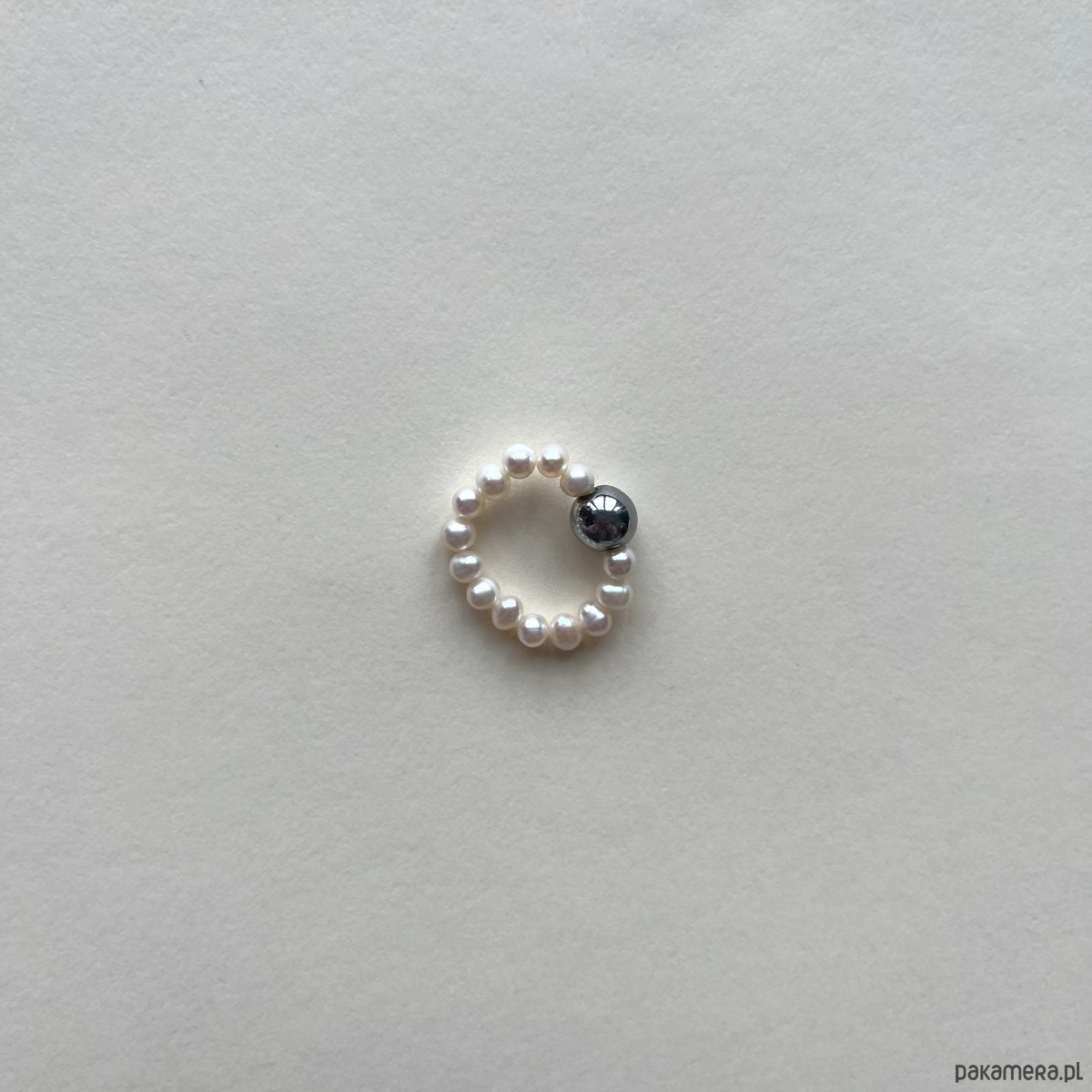Minimalistyczny pierścionek z naturalnej perły i kulki z kamienia.