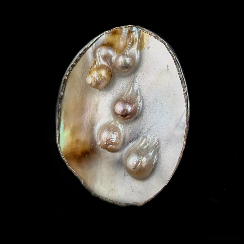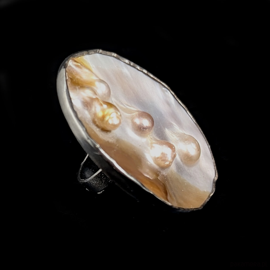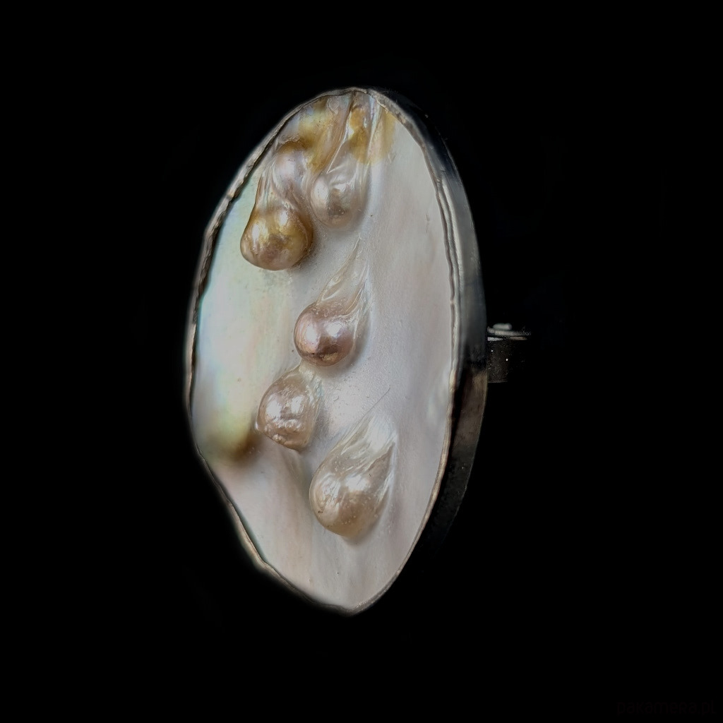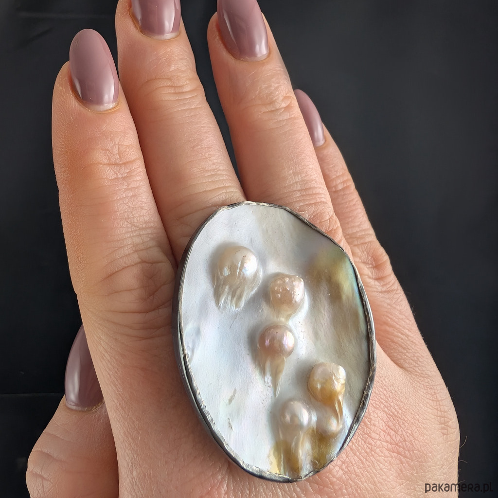 Pierścień wykonany z oksydowanego srebra próby 925 z oprawioną muszlą, którą narastają perły. Przepiękne zjawisko. Ponadczasowa elegancja, klasyka z nutą awangardy. Wymiary 48 x 38 mm, waga pierścienia 17 g. Rozmiar jubilerski 20, mogę powiększyc na max 21. Szerokość obrączki to 5 mm Polecam, piękna, ponadczasowa biżuteria. Polecam z wisiorem do kompletu.