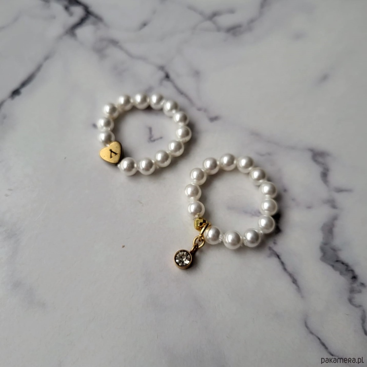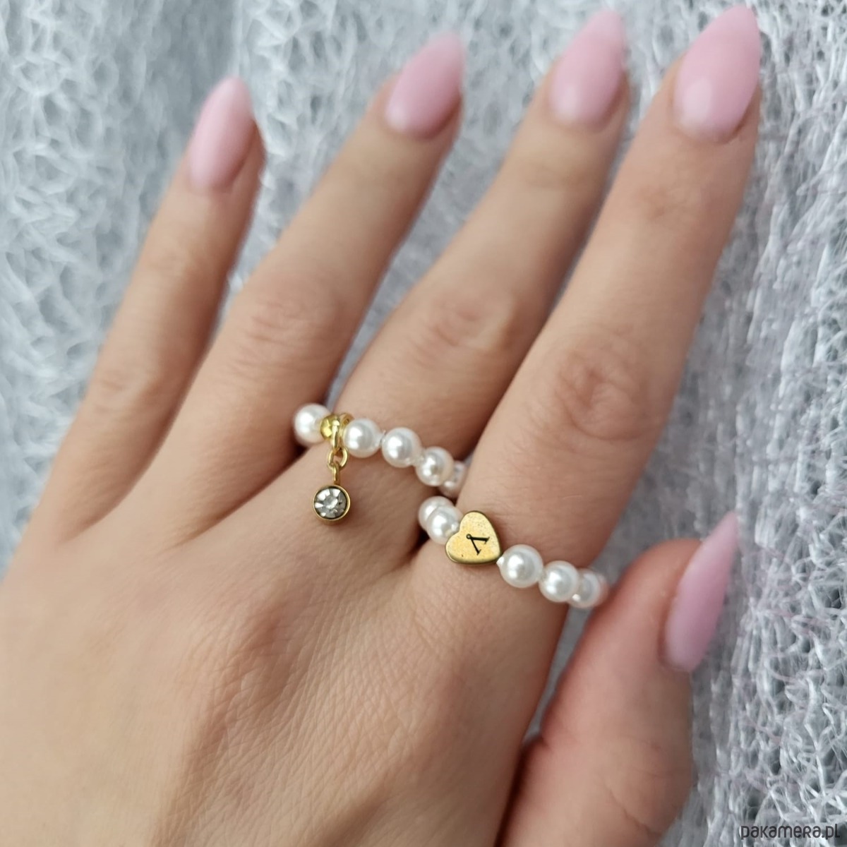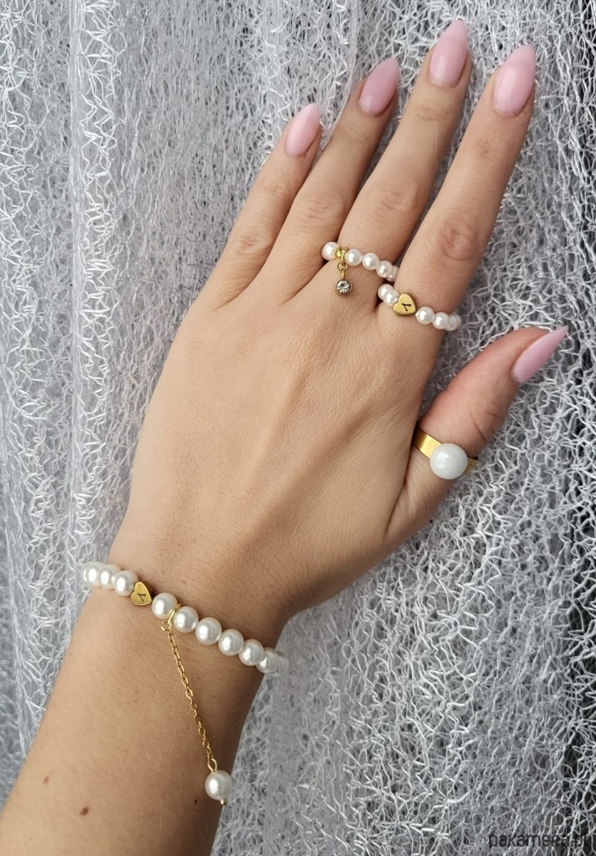 Pierścionek z perełek z ozdobną zawieszką cyrkonią lub serduszkiem hematytu (do wyboru), wykonany z perły muszlowej, stali szlachetnej pozłacanej i/lub hematytu. Pierścionek jest elastyczny, dzięki czemu dopasowuje się do obwodu palc. Pierścionek prezentuje się subtelnie i elegancko.