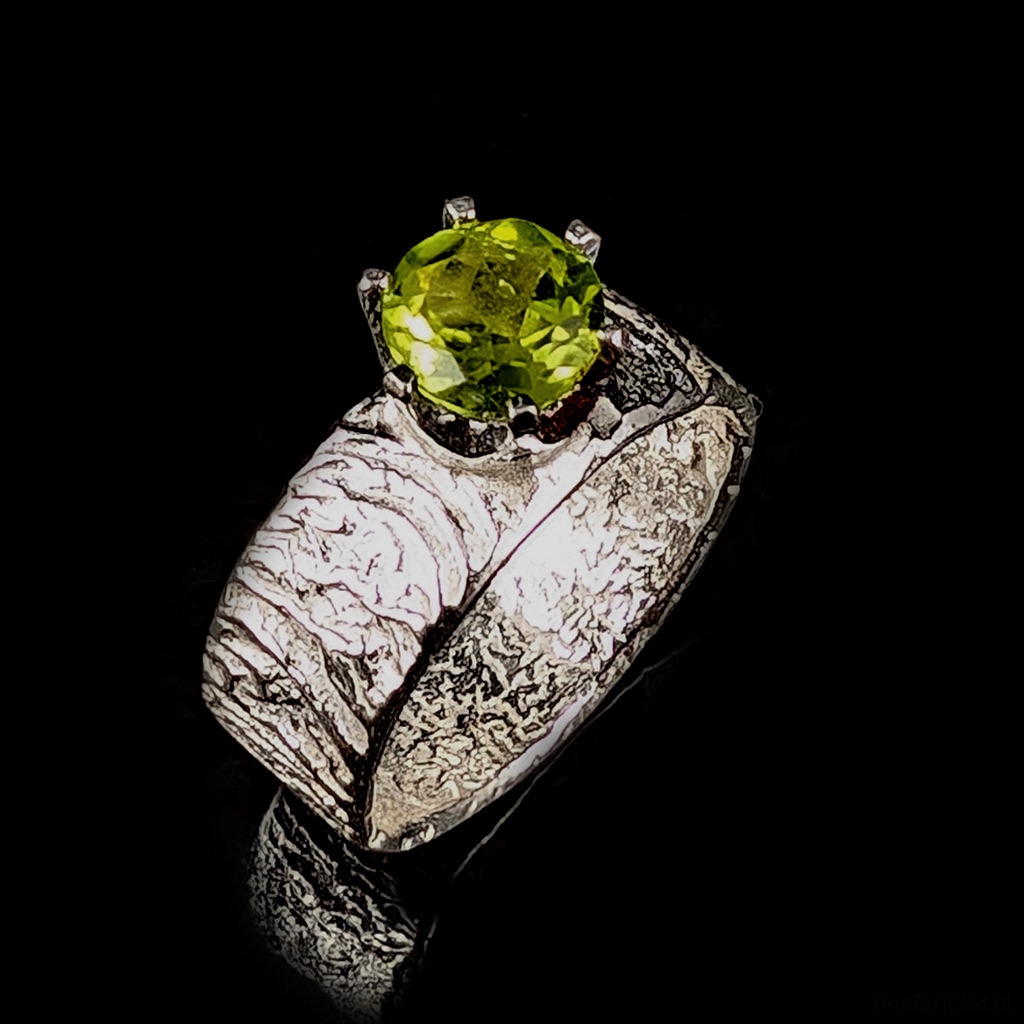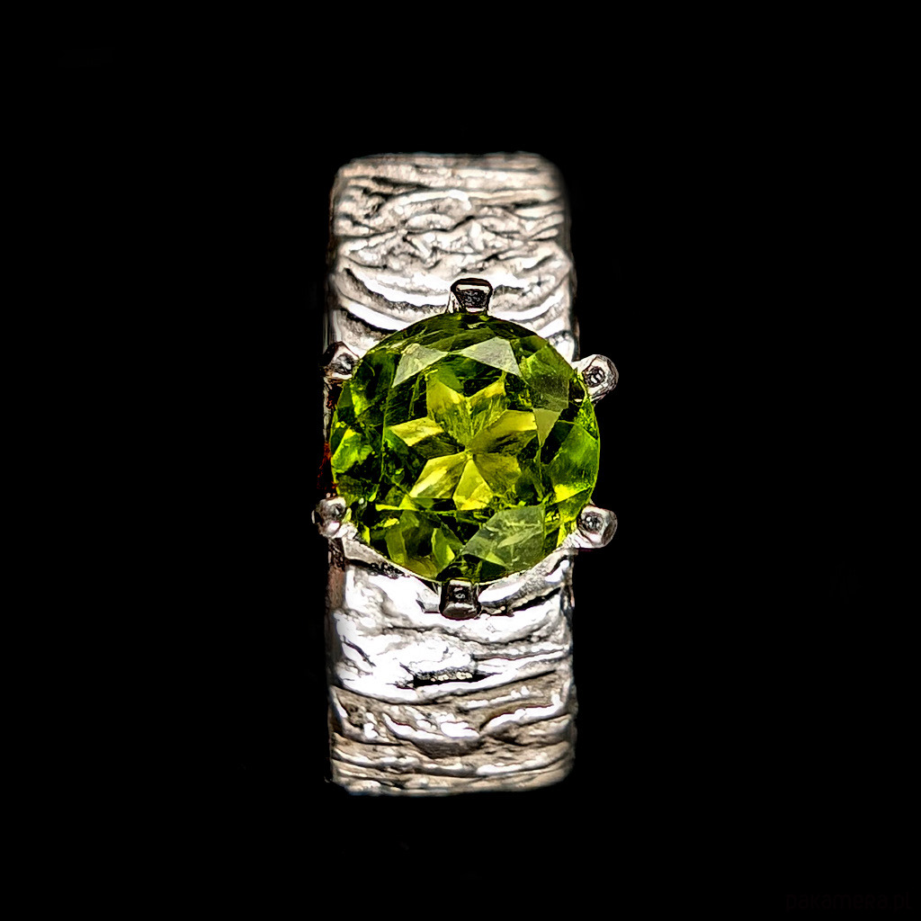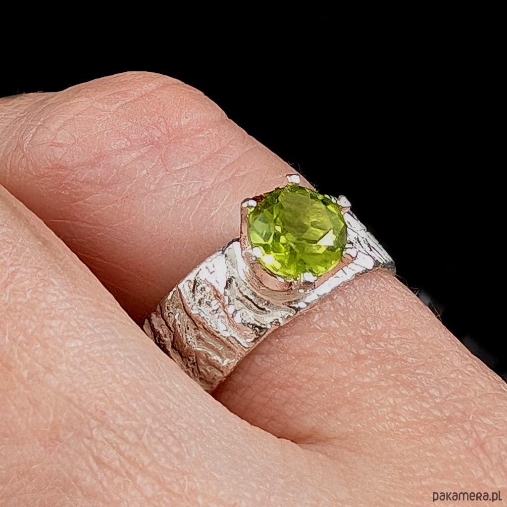 W srebrną, fakturowaną obrączkę oprawiony został piękny fasetowany peridot, szlachetna odmiana oliwinu o wymiarach 5 mm. Szerokość obrączki 6 mm. Rozmiar jubilerski 11, mogę powiekszyć obrączkę na rozmiar max 12. Możliwe wykonanie innego rozmiaru. Waga 4 g. Pierścionek zostanie zapakowany w ozdobne pudełeczko.