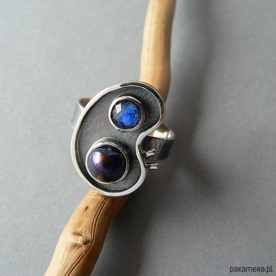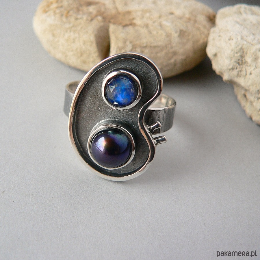 Pierścionek wykonany z ciemnej perełki hodowlanej, kamienia księżycowego i srebra. Srebro pokryte wyraźną fakturą, oksydowane, detale mocno polerowane. Wymiary frontu pierścionka 17/22 mm , średnica perełki- 9 mm, kamienia księżycowego 5 mm Obrączka regulowana , proszę o podanie noszonego rozmiaru przy zakupie, ustawię obrączkę.