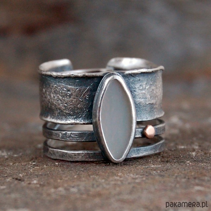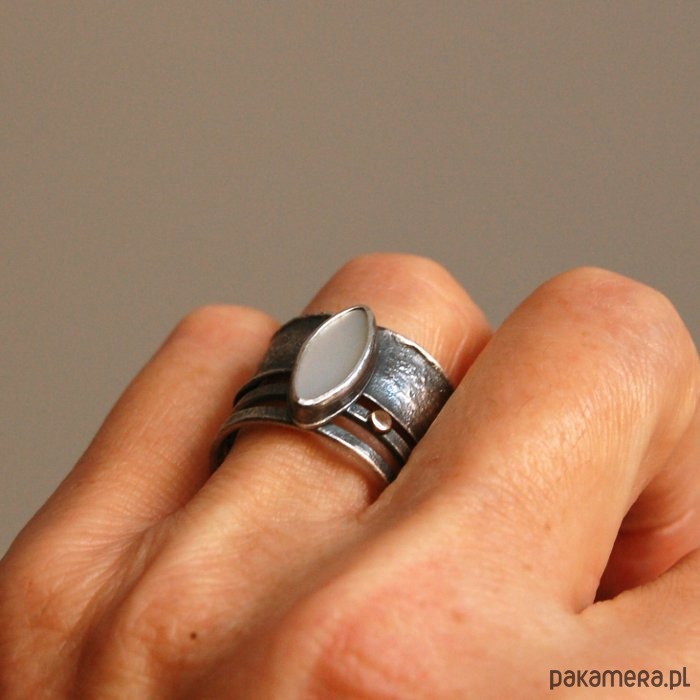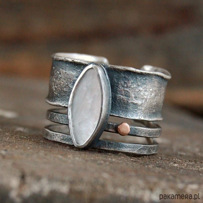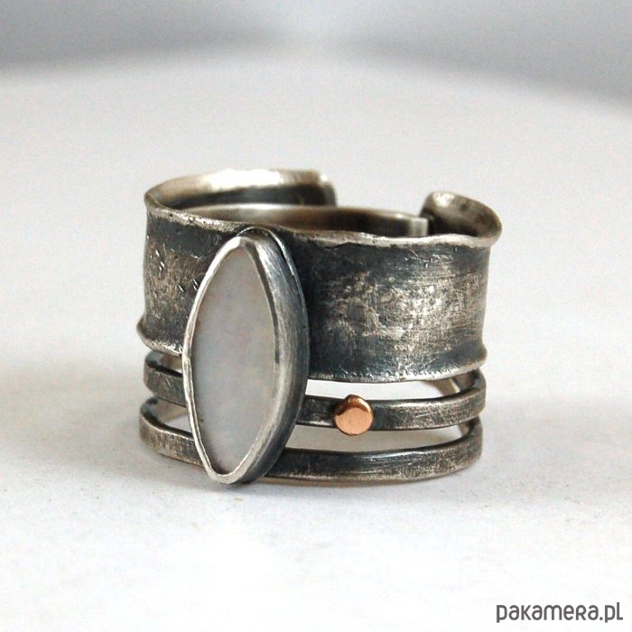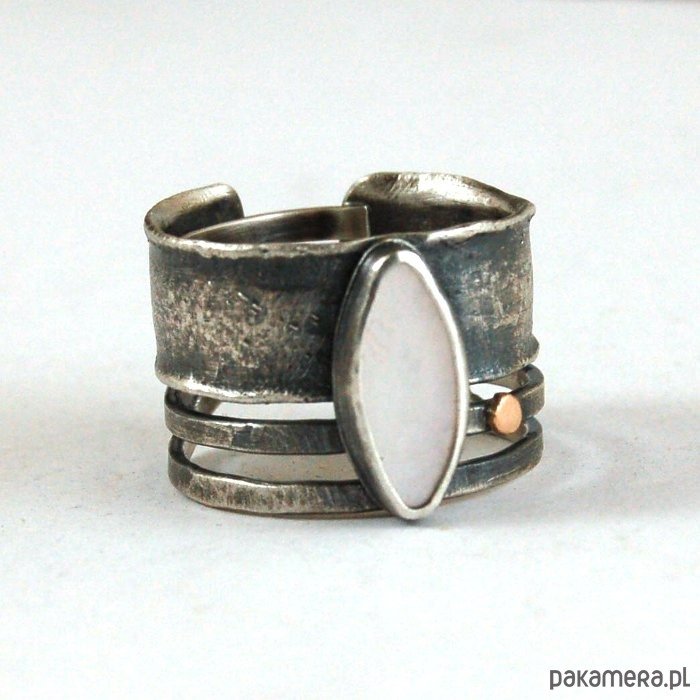 Pierścionek ze srebra, złota pr. 585 i masy perłowej. Srebro oksydowane, przetarte. Wielkość perły 0,5 - 1,3 cm, szerokość obrączki 1,5 cm. Rozmiar regulowany. Przy zamówieniu proszę o podanie rozmiaru, pierścionek zostanie ustawiony.