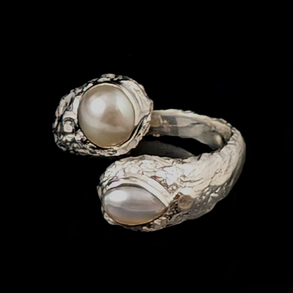 Pierścień wykonany ze srebra pr. 925 oraz przepięknych naturalnych pereł w oprawie 7,5 x 5 mm oraz okrągły 7 mm. Łezka perłowa ma obok wkomponowany maleńki surowy diament. Przeuroczy. Rozmiar jubilerski min 15, max 19. Ustawię odpowiedni, proszę o wiadomość. Waga 8 g. Wykonany przez dostawcę kamieni. Pierścień zostanie zapakowany w ozdobne pudełeczko.