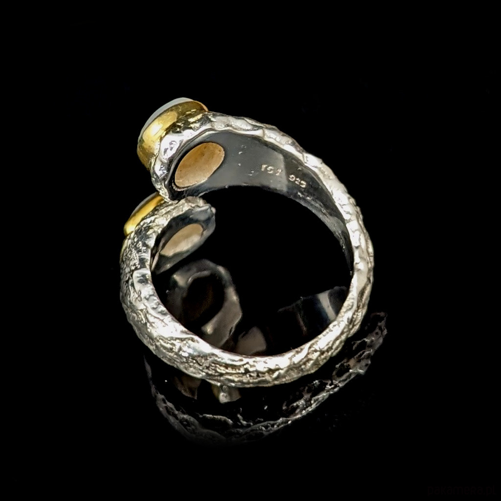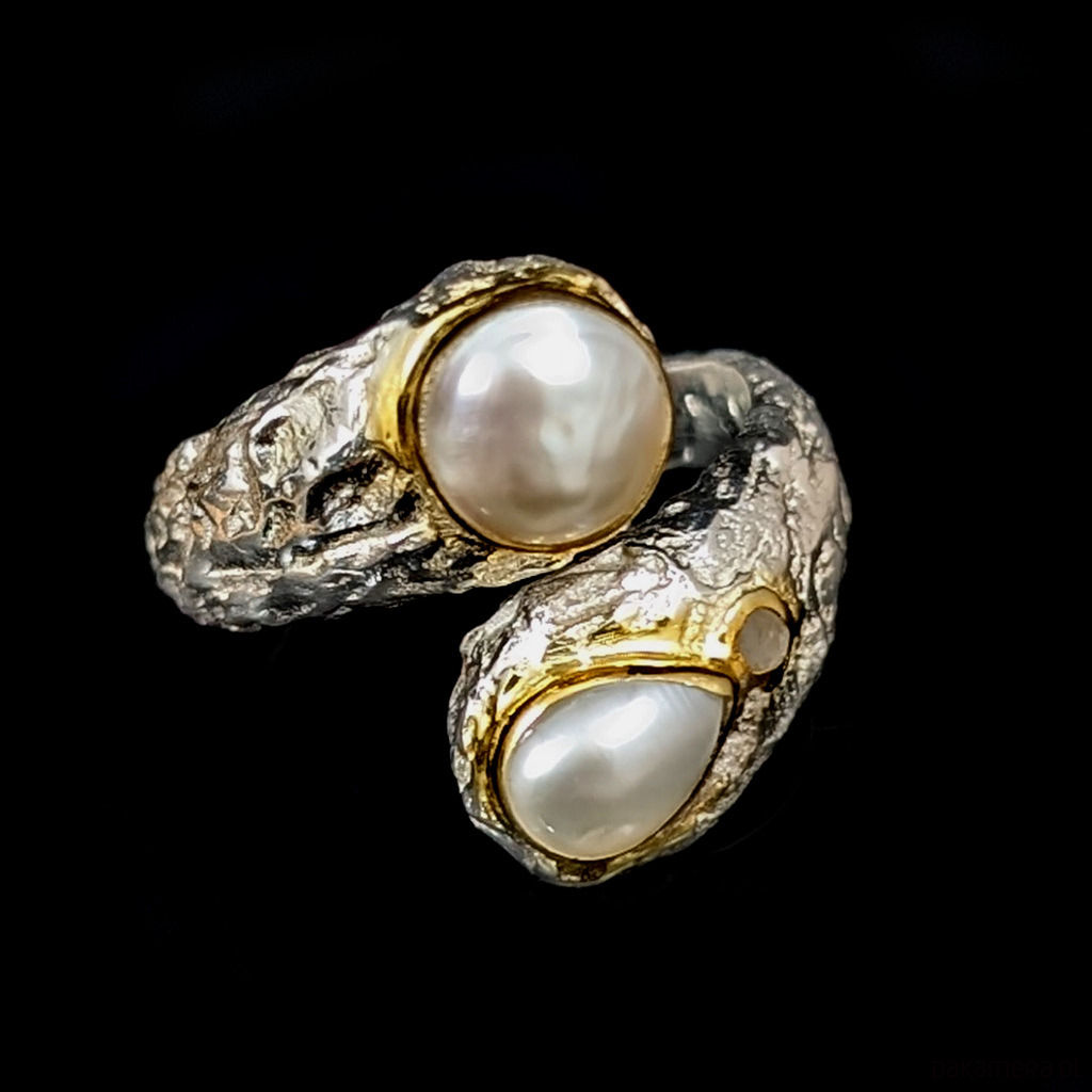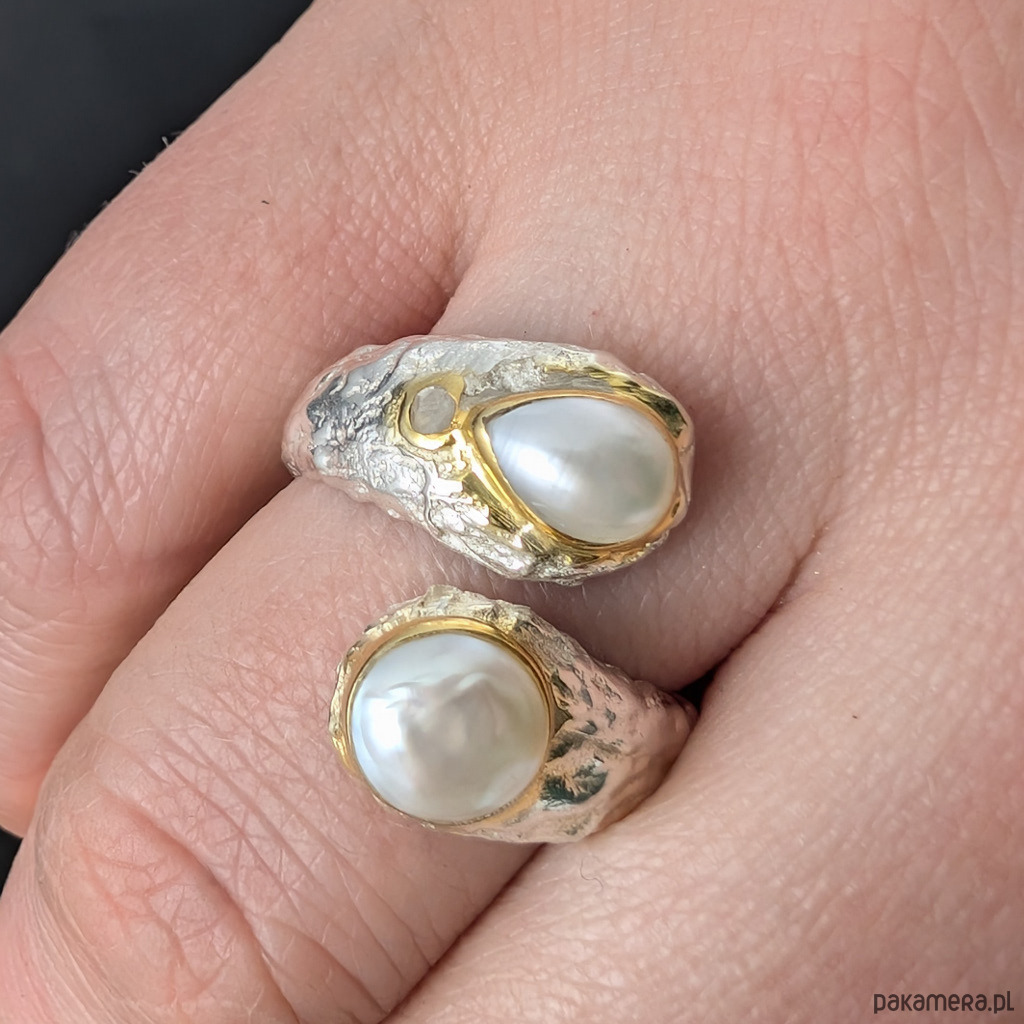 Pierścień wykonany ze srebra pr. 925 oraz przepięknych naturalnych pereł w oprawie 7,5 x 5 mm oraz okrągły 7 mm. Łezka perłowa ma obok wkomponowany maleńki surowy diament. Srebro w oprawie pereł złocone, są to delikatne powłoki, które z czasem mogą się wytrzeć. Przepiękny. Rozmiar jubilerski min 15, max 19. Ustawię odpowiedni, proszę o wiadomość. Waga 8,5 g. Wykonany przez dostawcę kamieni. Pierścień zostanie zapakowany w ozdobne pudełeczko.