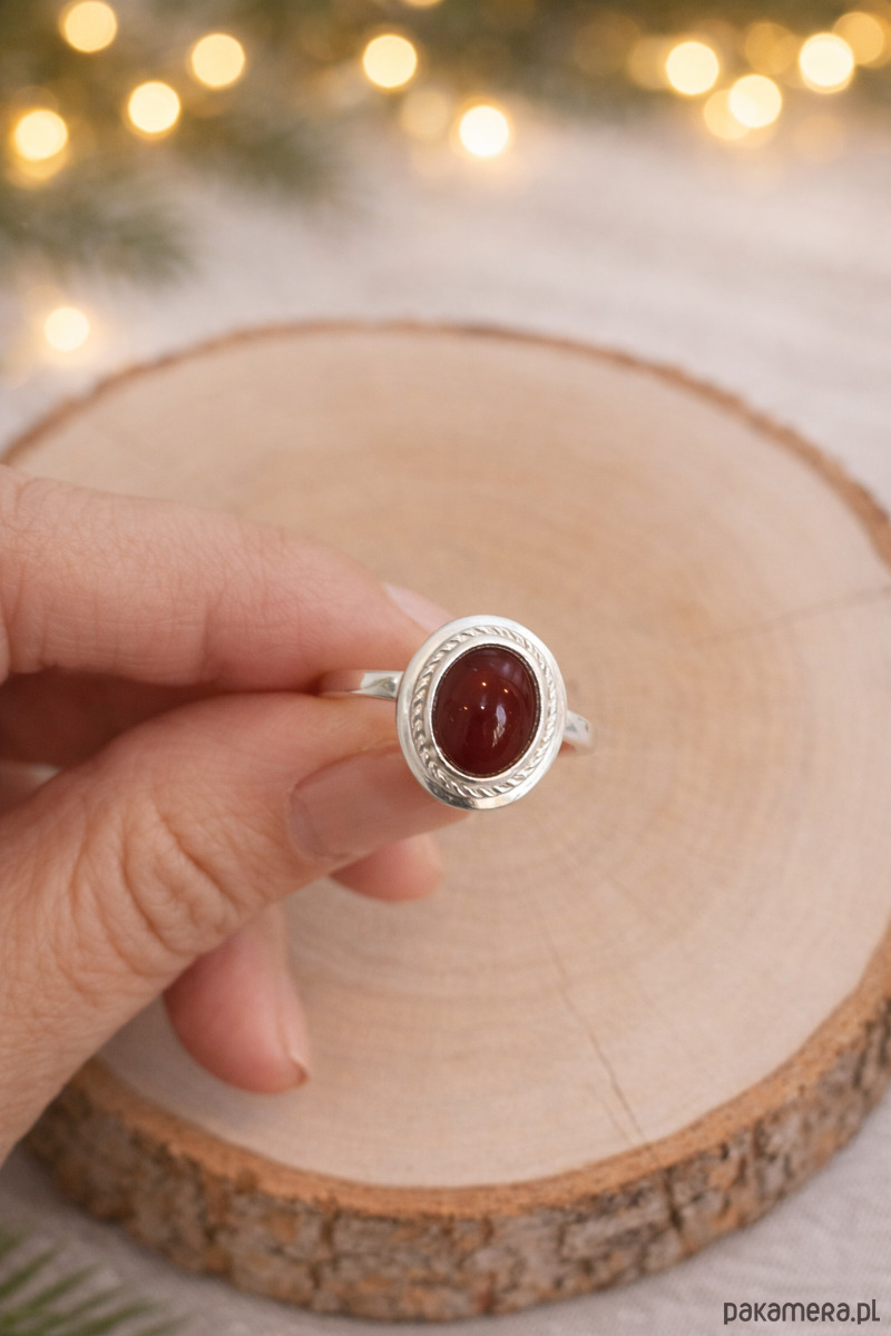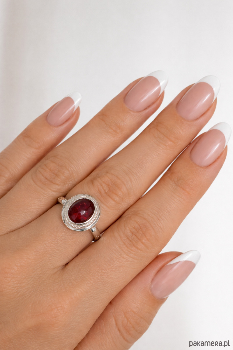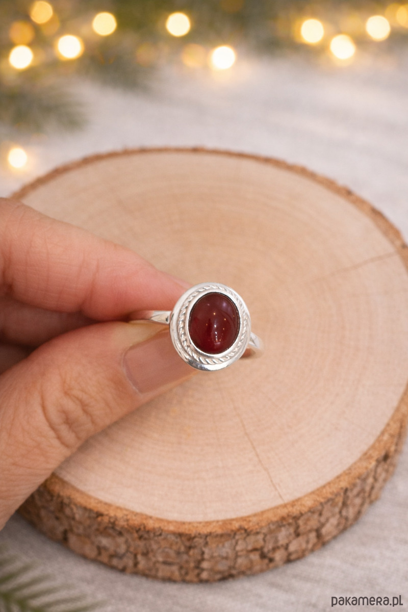 Elegancki pierścionek wykonany ze srebra z owalnym naturalnym kamieniem w odcieniu głębokiej czerwieni. Klasyczna forma w połączeniu z dekoracyjną oprawą podkreśla ponadczasowy charakter biżuterii.