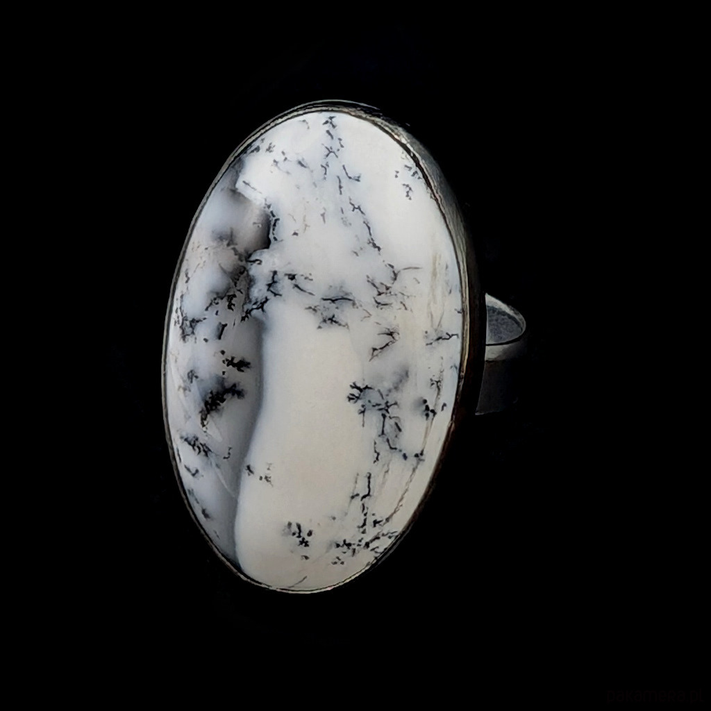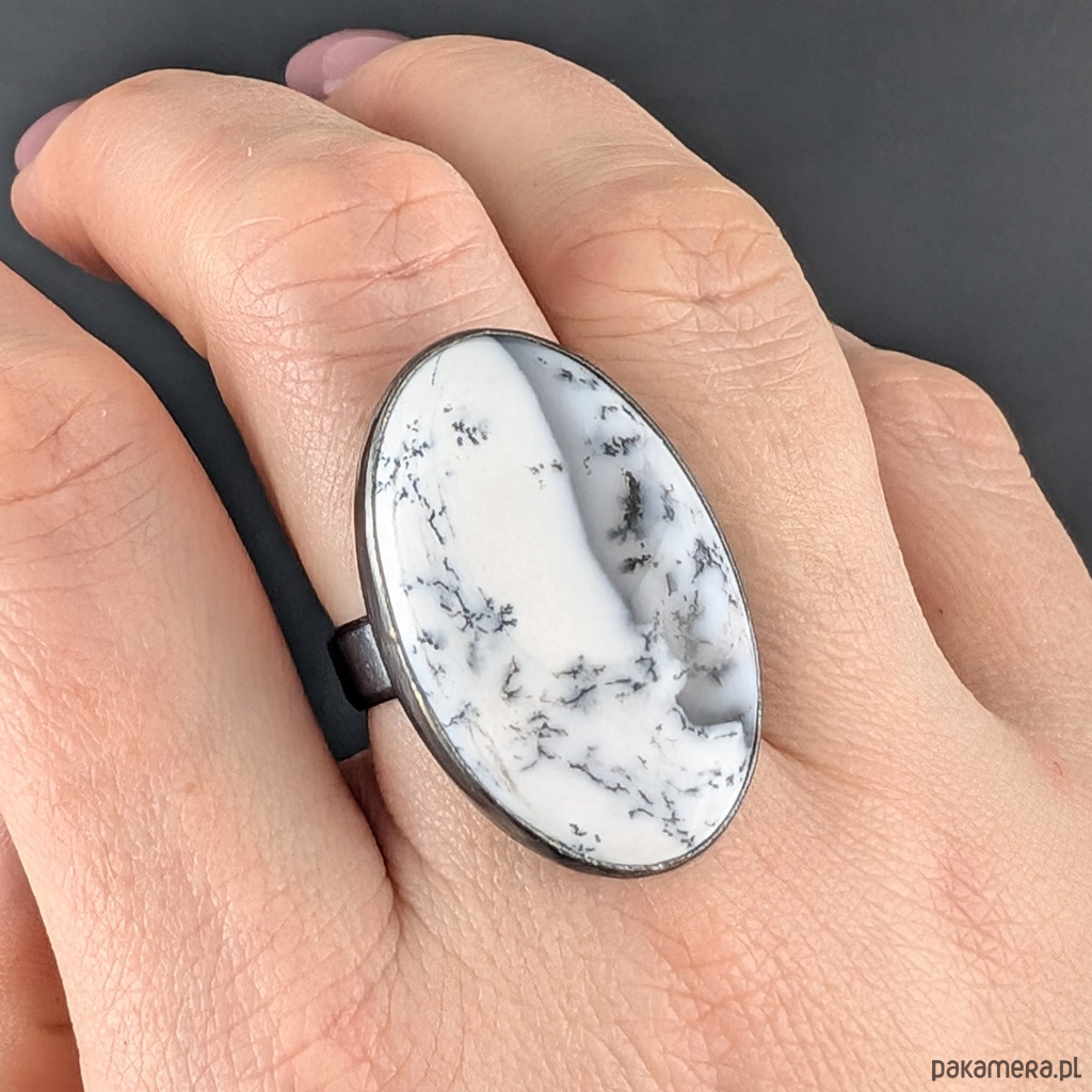Pierścień z pięknym agatem dendrytowym. Kamień oprawiony w oksydowane srebro pr. 925. Rozmiar pierścionka regulowany w szerokim zakresie, proszę napisać na jaki dopasować. Wymiary oprawy 32 x 22 mm,, waga 12,3 g, obrączka szer. 5 mm. Pierścień będzie zapakowany w ozdobne pudełeczko.
