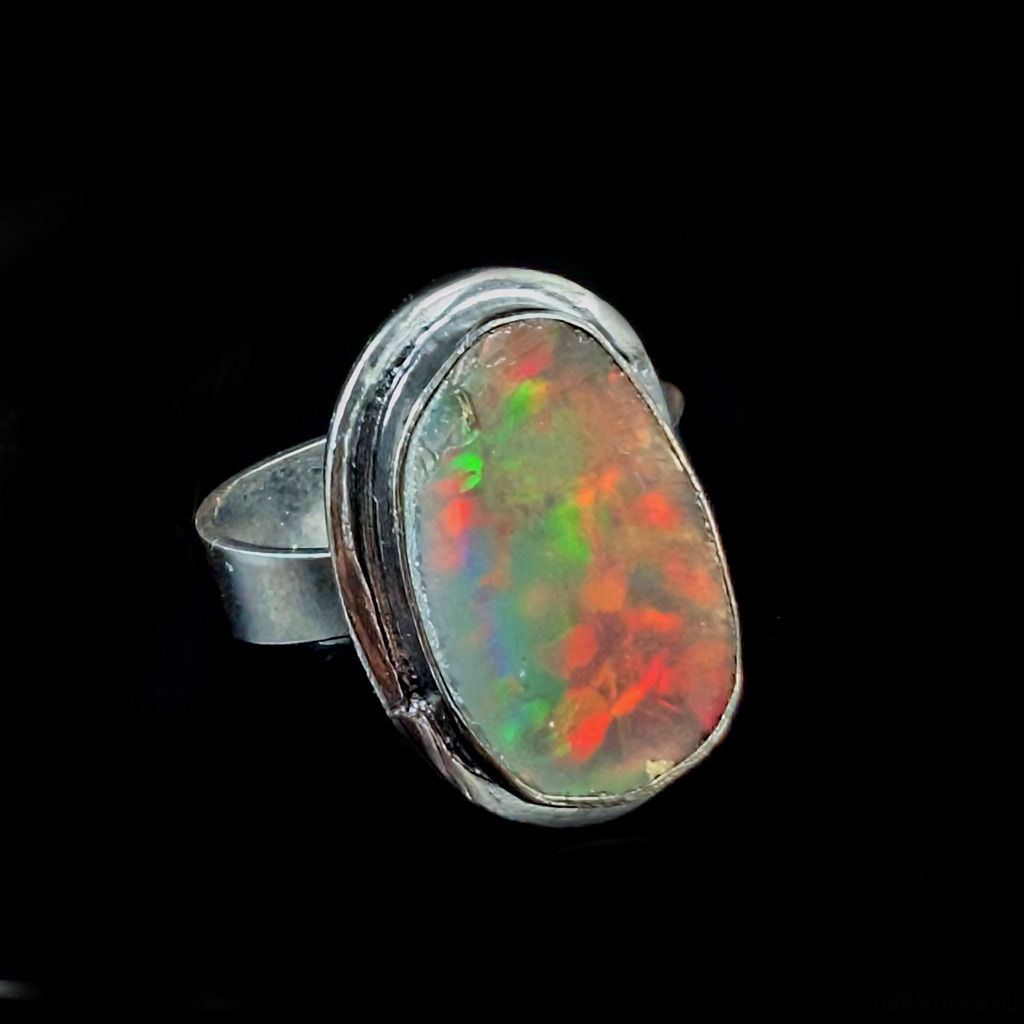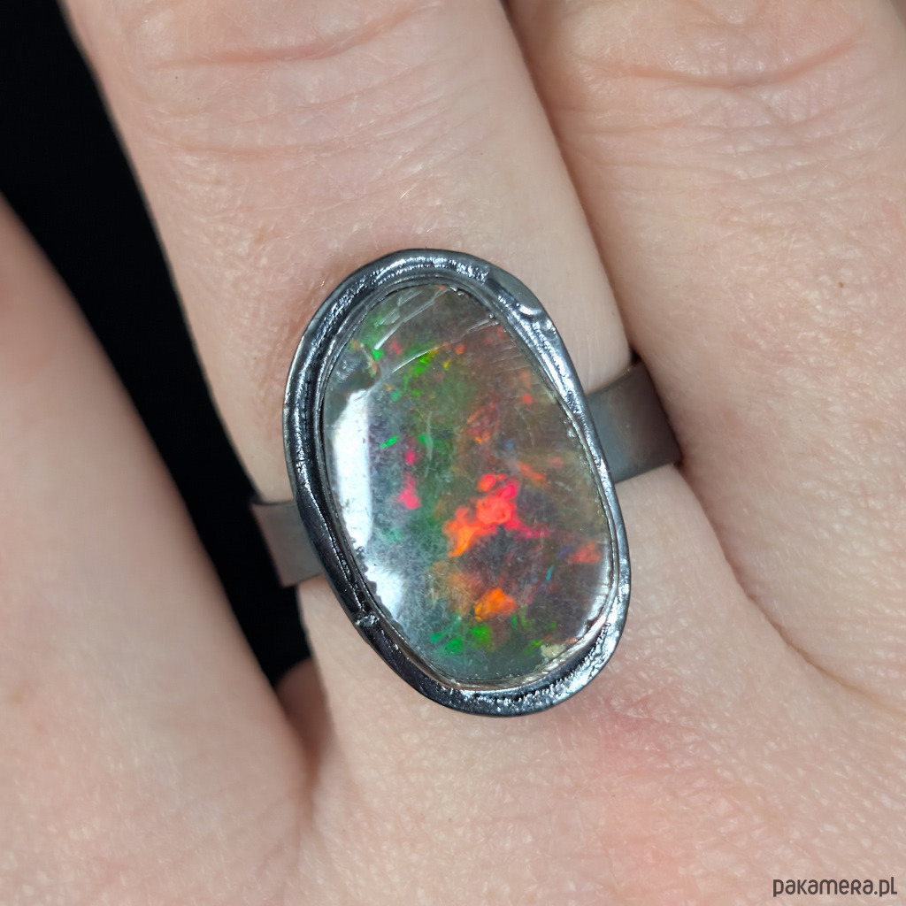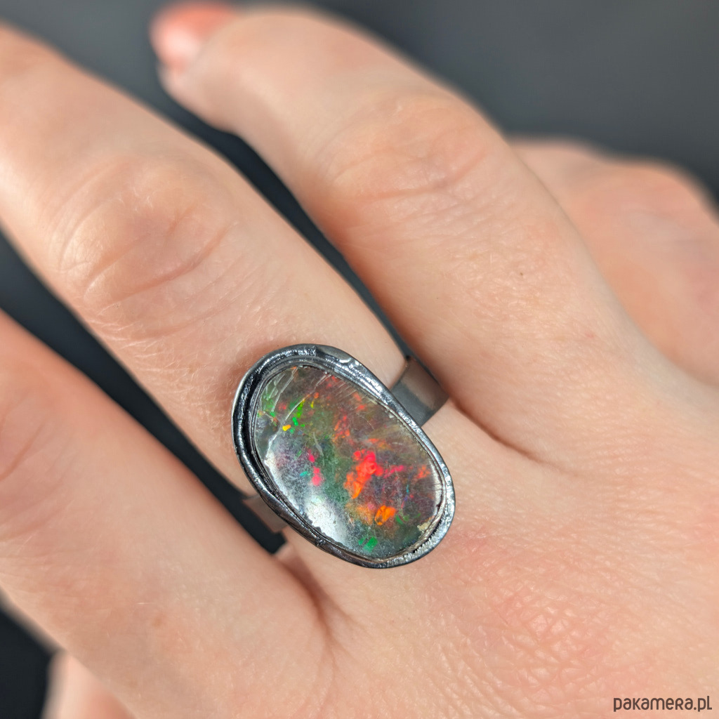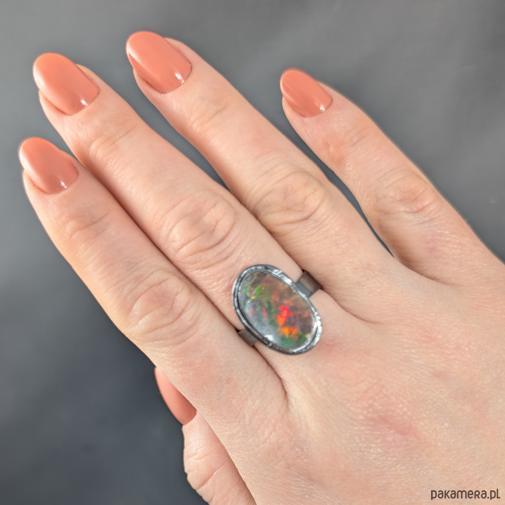 Pierścionek wykonany ze srebra próby 925, oksydowane, przetarte, fakturowane. Rozmiar pierścionka dzięki otwartej podstawie regulowany, z łatwością można dopasować na dowolny rozmiar w zakresie 10-23. Proszę napisać, na jaki ustawić. Ozdobą pierścionka jest piękny, szlachetny opal z Etiopii. Wymiary oprawy kamienia 22 x 14 mm, szerokość maksymalna obrączki 5mm Waga 6,4 g. Pierścień zostanie zapakowany w ozdobne pudełeczko.