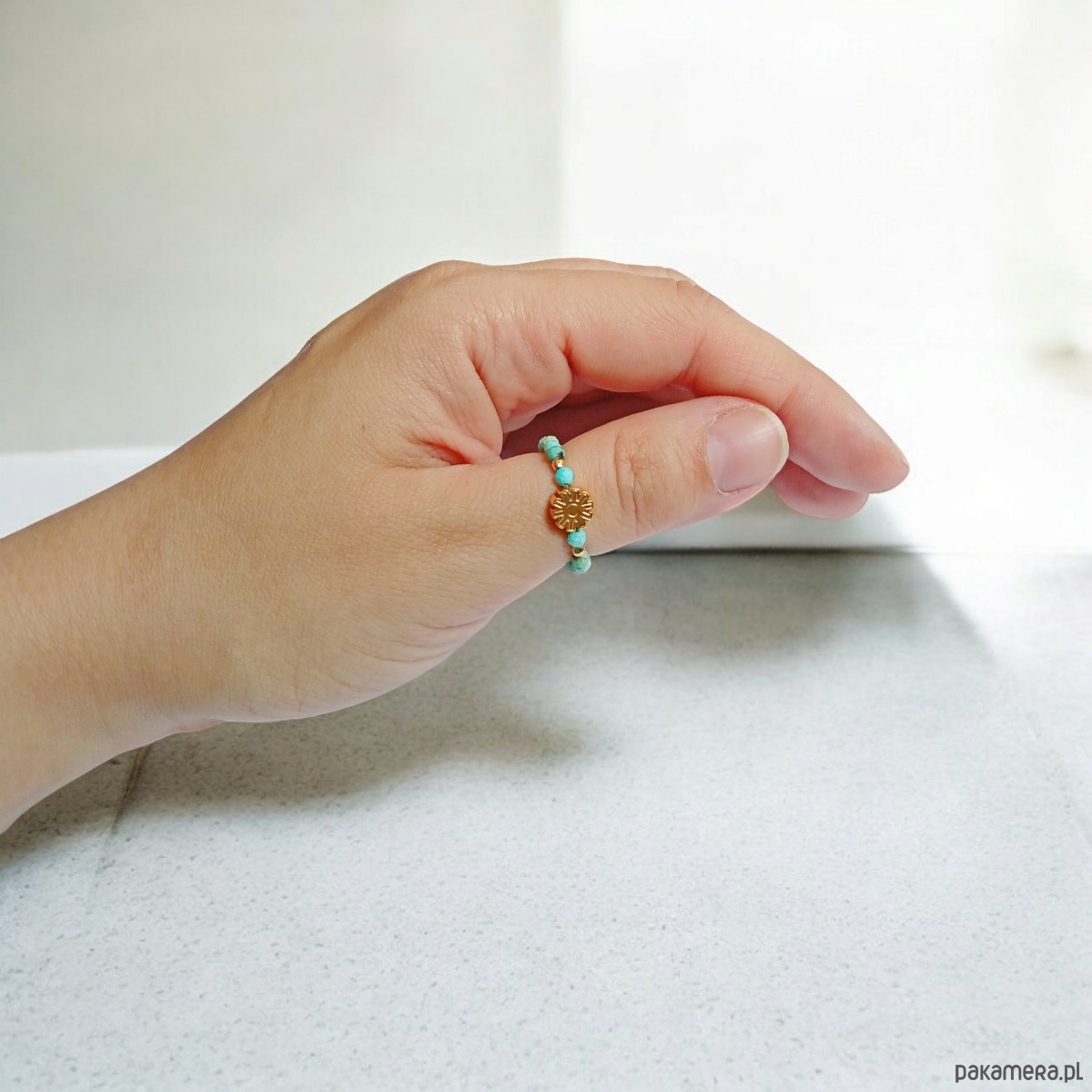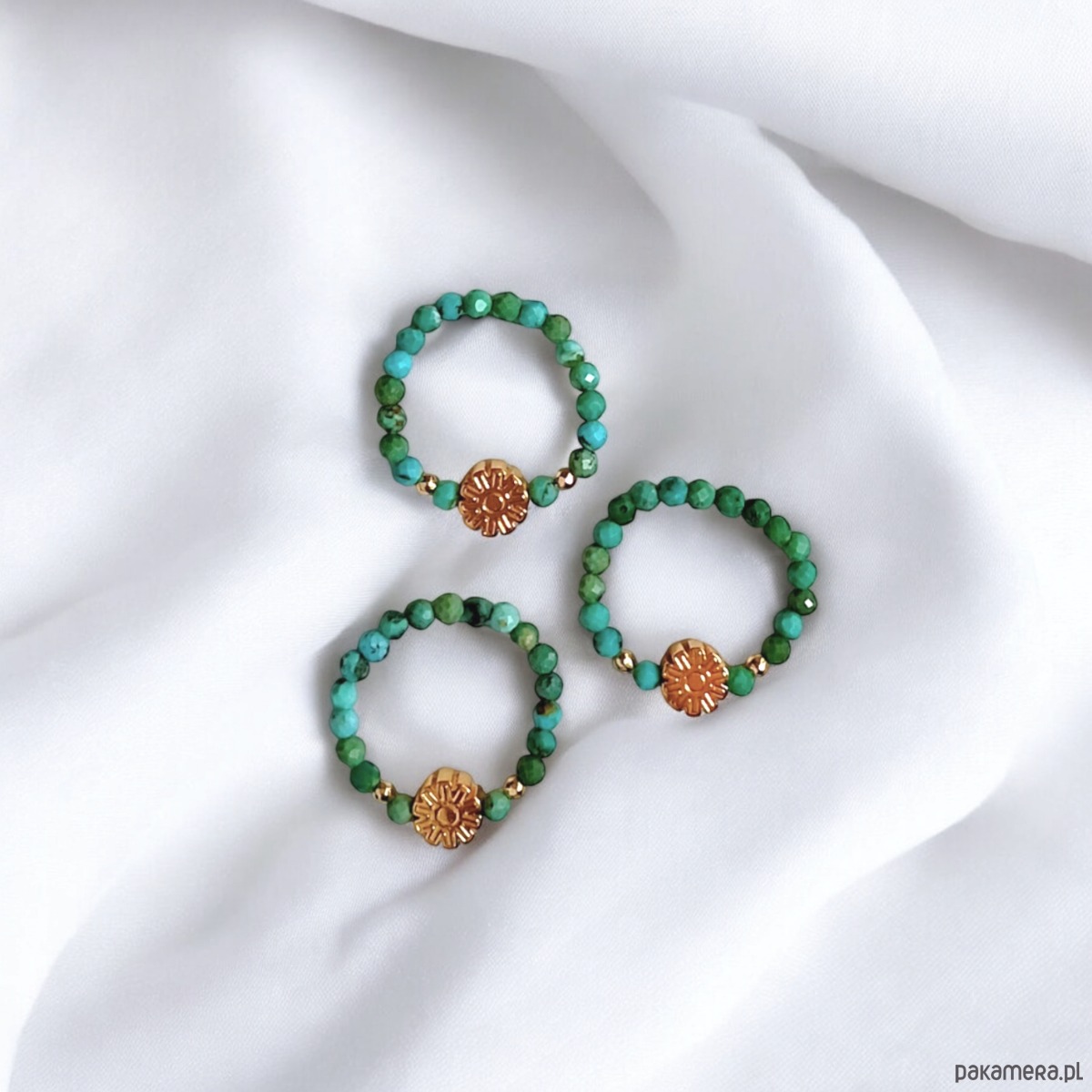 Pierścionek elastyczny został wykonany z drobniutkich kuleczek naturalnego turkusu w odcieniach błękitu i zieleni (ok.2,8mm), przekładek ze złotego hematytu oraz kwiatuszka z hematytu.