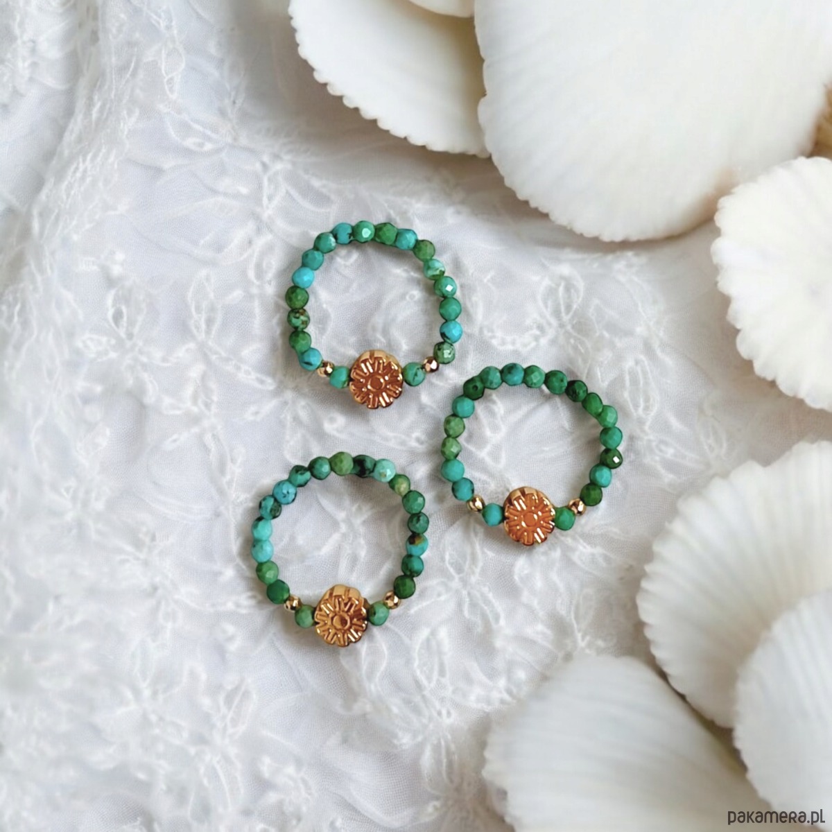 Pierścionek elastyczny został wykonany z drobniutkich kuleczek naturalnego turkusu w odcieniach błękitu i zieleni (ok.2,8mm), przekładek ze złotego hematytu oraz kwiatuszka z hematytu.
