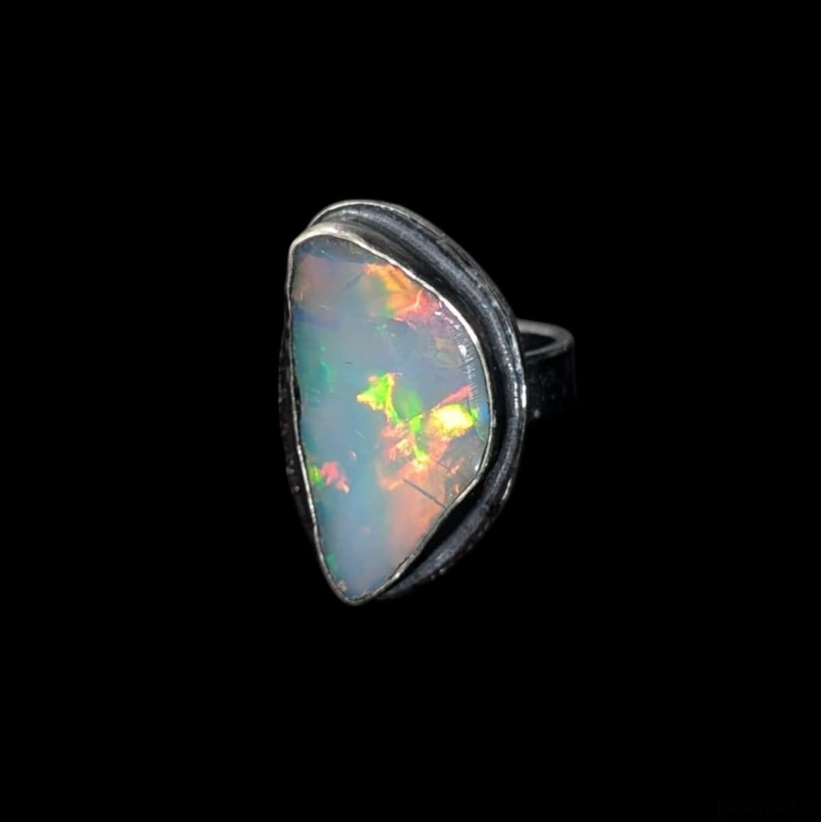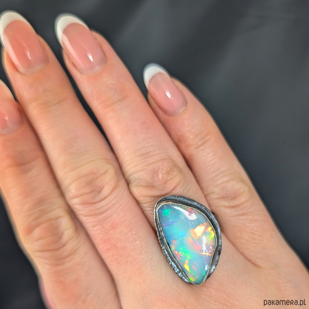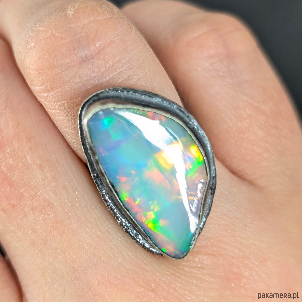 Pierścień z oprawionym dużym opalem etiopskim. Srebro pr.925, oksydowane. Wymiary oprawy 26 x 17 mm. Waga 9,5 g. Obrączka ma 5 mm szerokości. Rozmiar jubilerski 12, mogę powiększyć na max 13. Zjawiskowe barwy kamienia. Zapakowany w ozdobne pudełeczko.