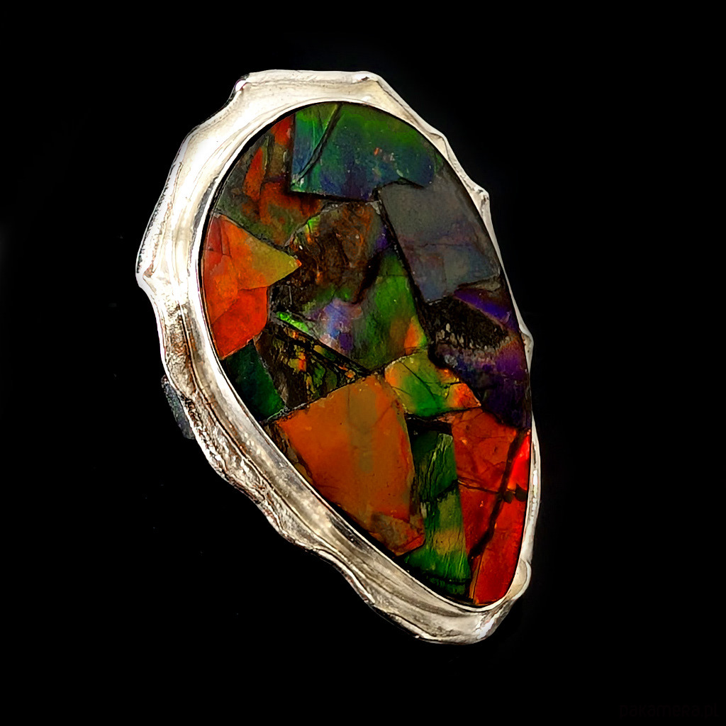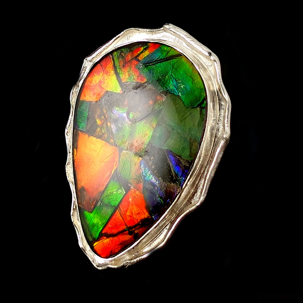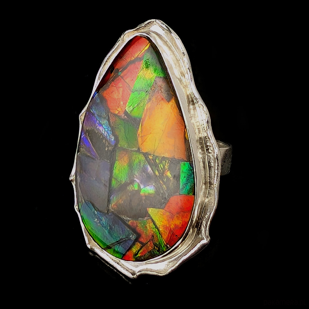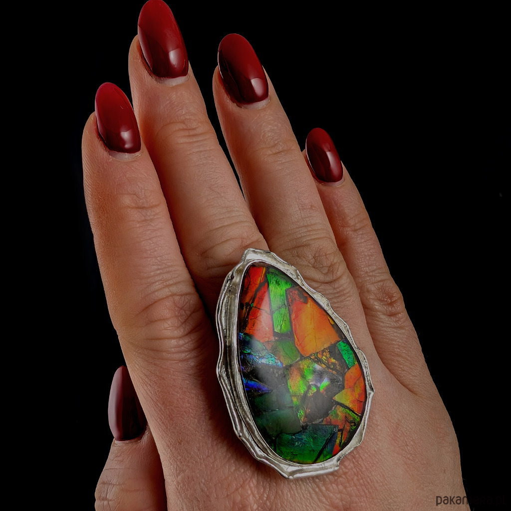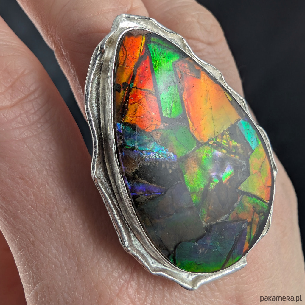 Tęczowa perła wśród minerałów, ammolit uznany jest za jeden z najrzadszych kamieni szlachetnych. Rzadki i poszukiwany w jubilerstwie naturalny ammolit z Kanady jest fragmentem muszli pradawnych kopalnych amonitów sprzed 400 mln lat. Okaz to piękny kompozyt amonitu, ammolitu oraz kwarcu. Srebro próby 925, Wymiary całej oprawy 47 x 33 mm. Rozmiar jubilerski 19, mogę dopasować w zakresie 19-23. Waga pierścionka 18 gramów. Pierścień zostanie zapakowany w ozdobne pudełeczko.