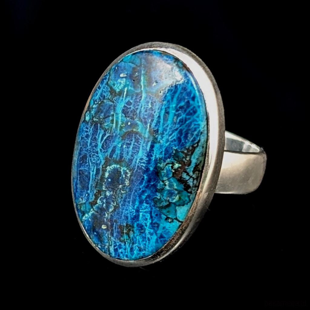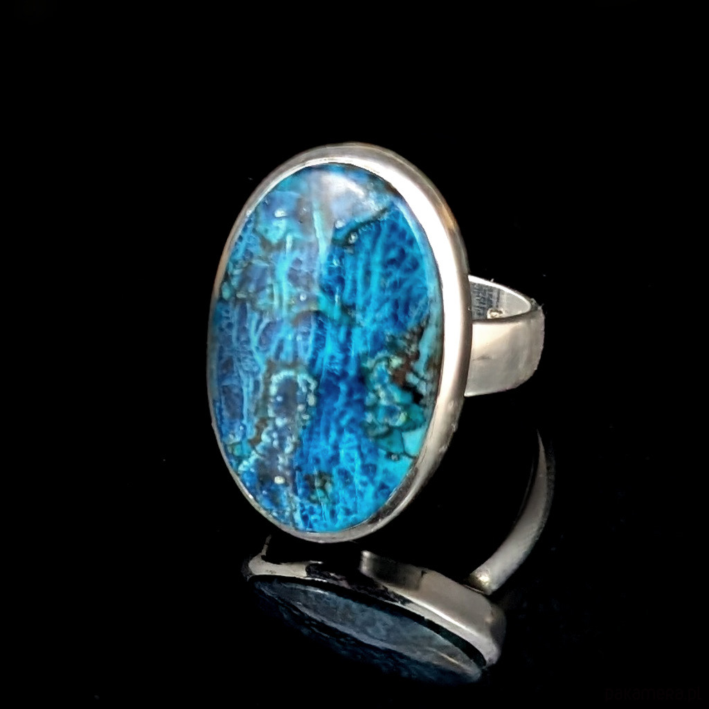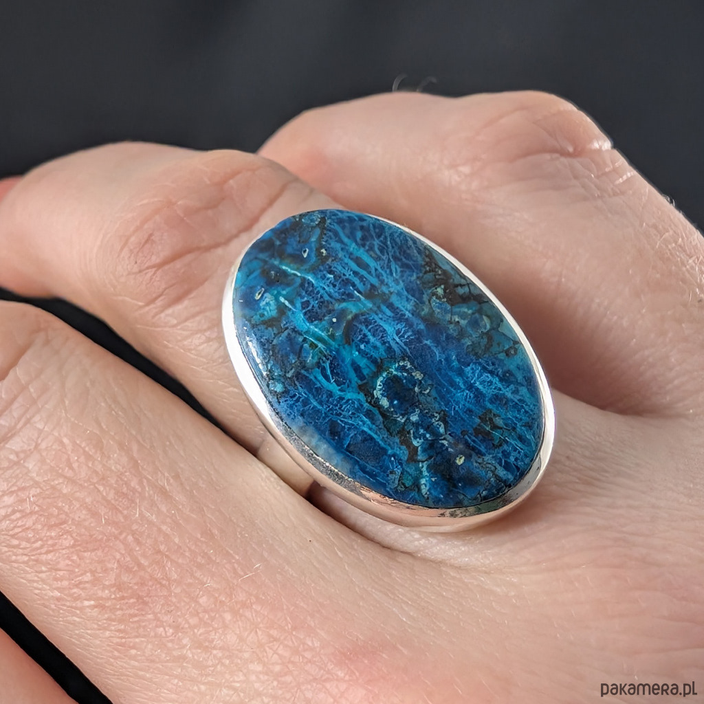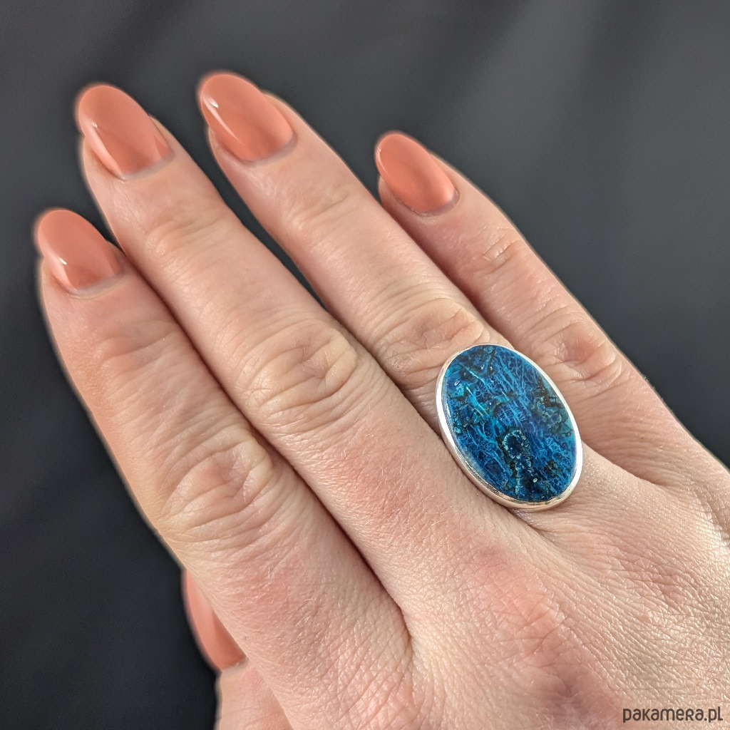 Ciekawy pierścień z morskim afganitem oprawionym w srebro próby 925. Wymiary oprawy 25 x 17 mm, rozmiar regulowany w wąskim zakresie 15-18, proszę napisać na jaki dopasować. Waga 8,4 g. Zostanie zapokowany w ozdobne pudełeczko. Wykonany przez dostawcę kamieni