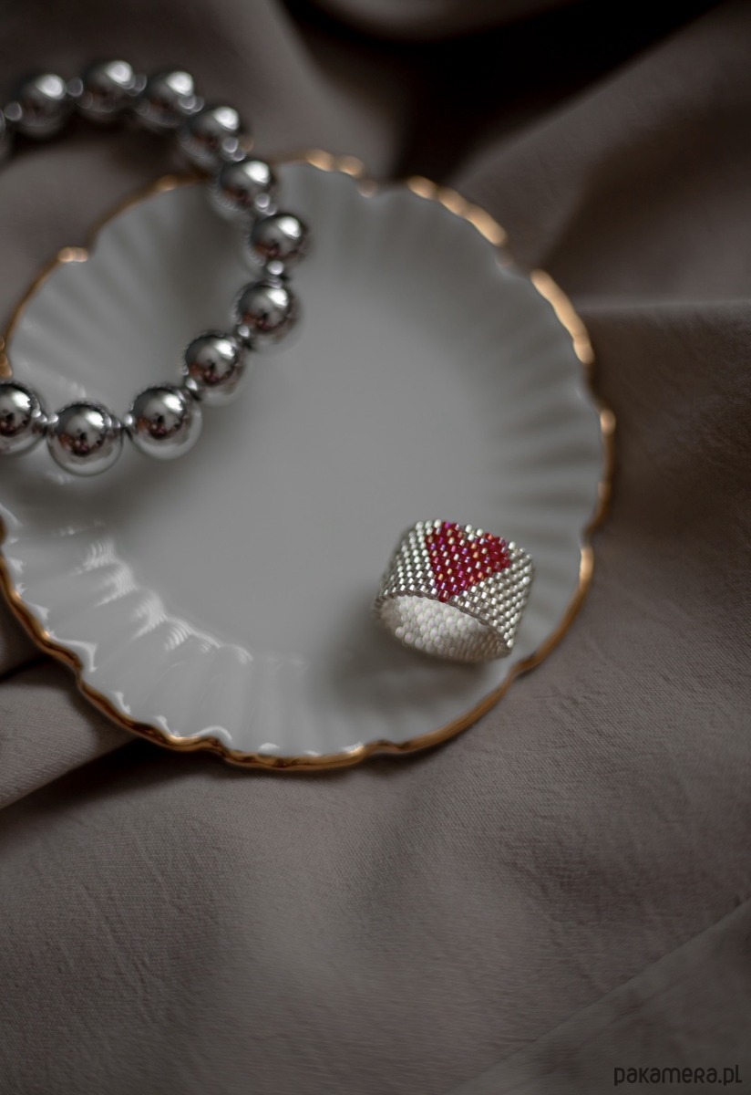 Ręcznie wykonany pierścionek z koralików Miyuki Delica w kolorze srebrnym, z motywem czerwonego serca.
