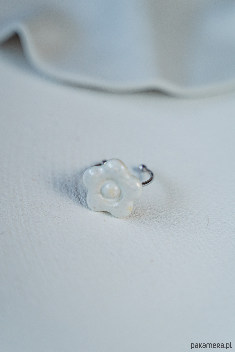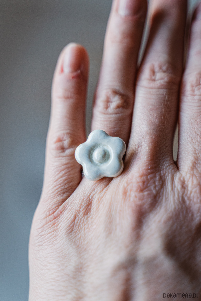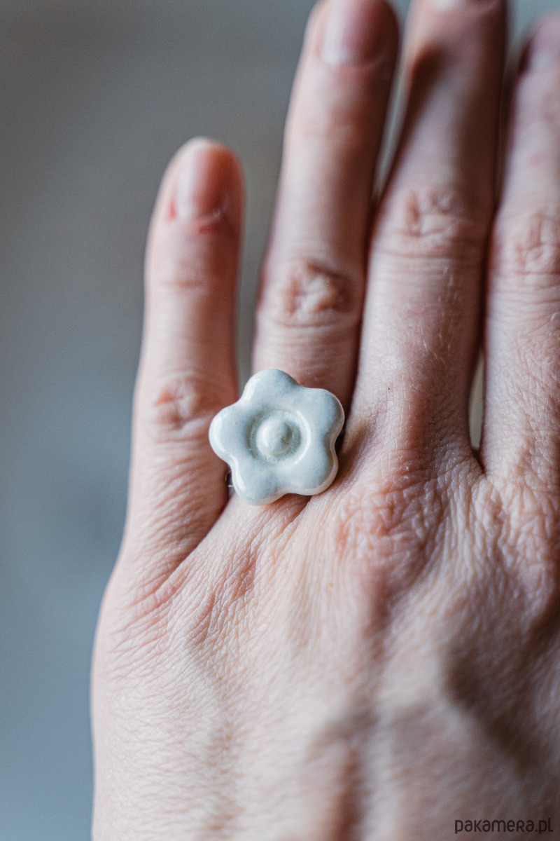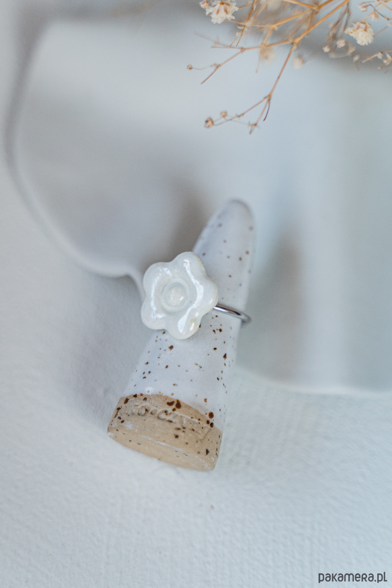 Ten pierścionek powstał z najwyższej jakości porcelany Parian, a szkliwo nadaje mu dodatkowego połysku i blasku.