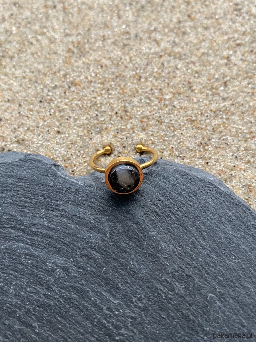 Elegancki pierścionek handmade z ciemnym, lekko połyskującym oczkiem. Prosta forma podkreśla charakter pierścionka ii pasuje do nowoczesnych stylizacji.