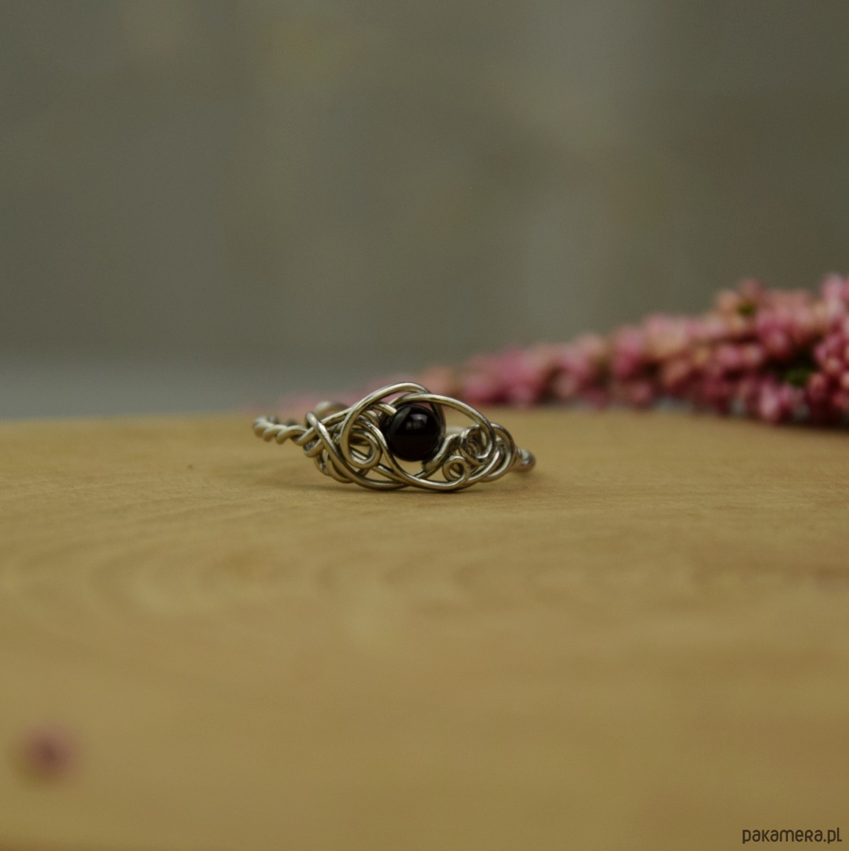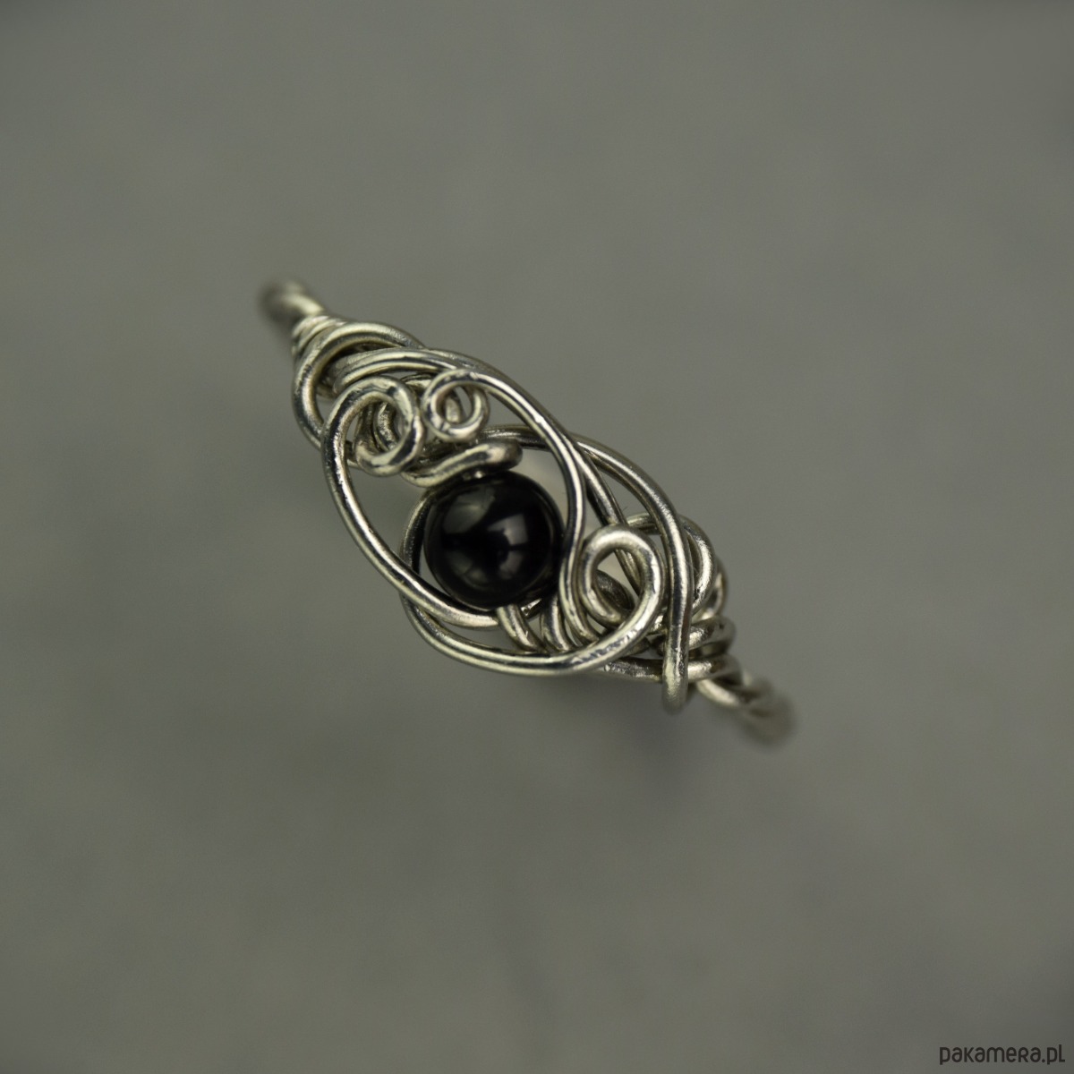 Ręcznie robiony regulowany pierścionek z czarnym onyksem. Wykonany w całości z drutów ze stali chirurgicznej, techniką wire wrapping. Rozmiar regulowany - pierścionek można samodzielnie wyregulować palcami.