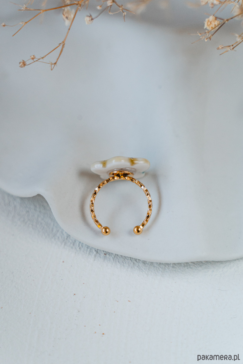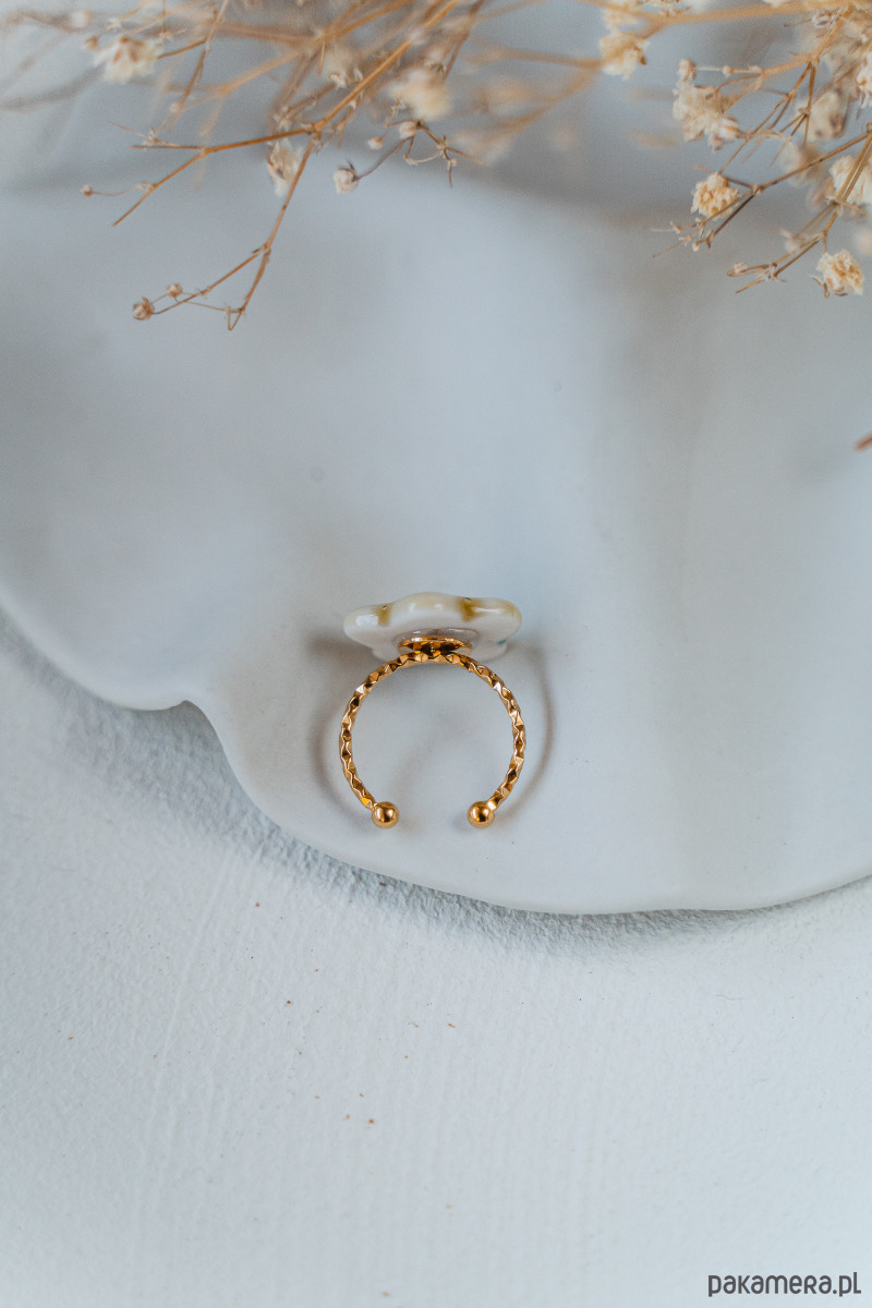 Ten pierścionek powstał z najwyższej jakości porcelany Parian, a szkliwo nadaje mu dodatkowego połysku i blasku.