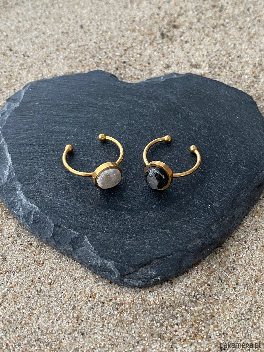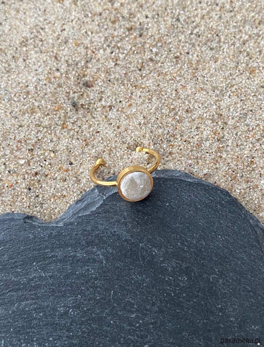 Minimalistyczny pierścionek z jasnym, naturalnie wyglądającym oczkiem. Regulowana obrączka sprawia, że łatwo dopasować go do palca.