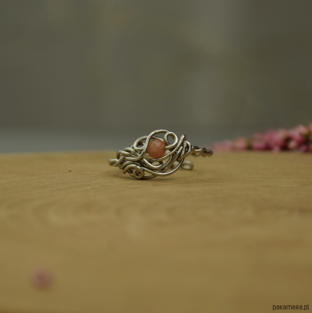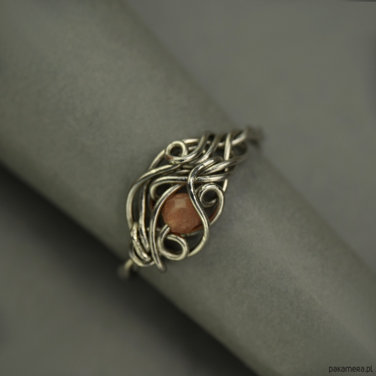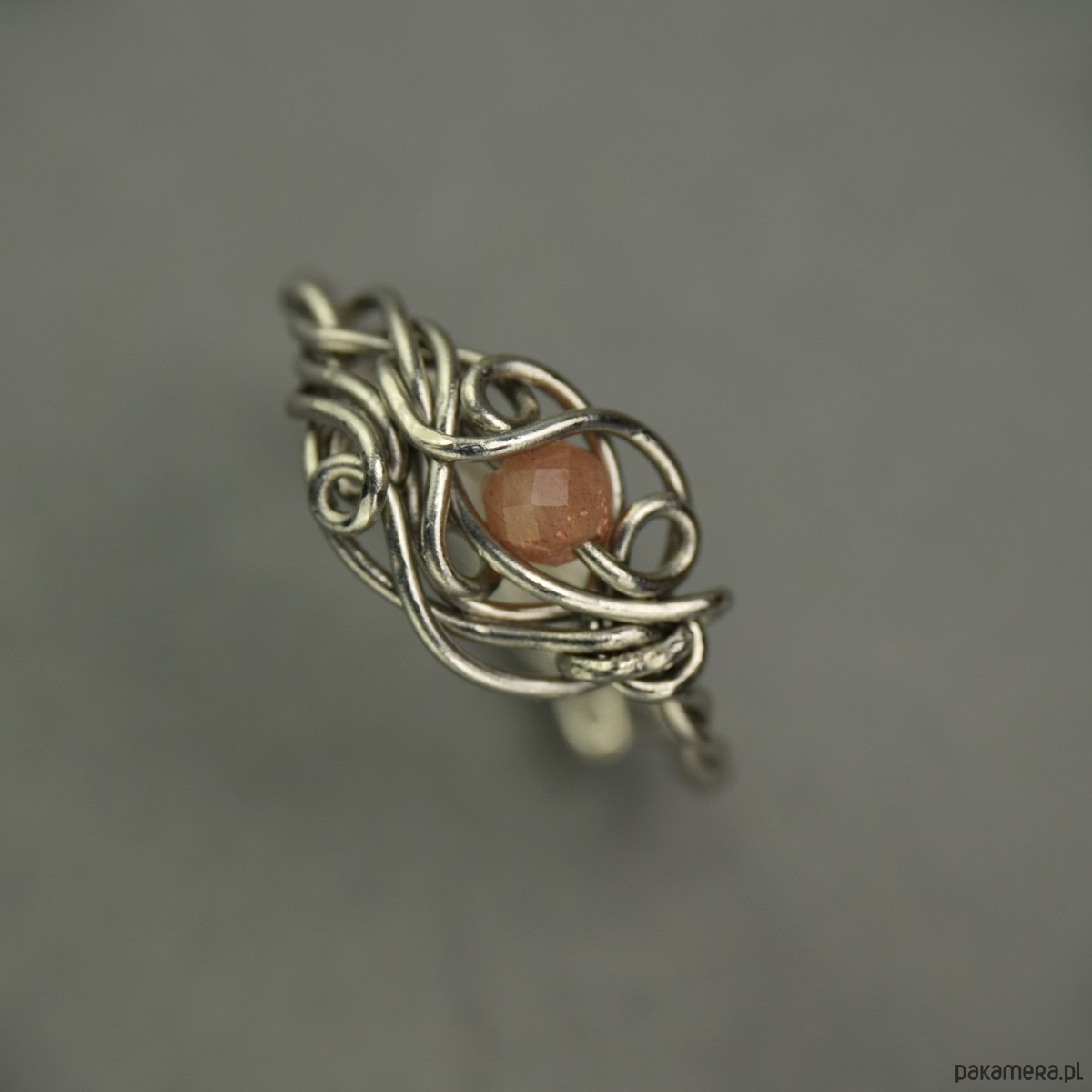 Ręcznie wykonany pierścionek z kamieniem słonecznym. Pierścionek zrobiłam w całości z drutów ze stali chirurgicznej techniką wire wrapping.