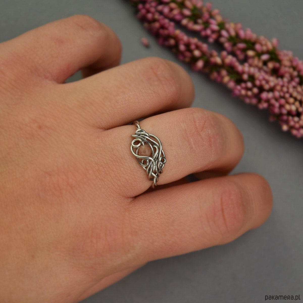 Rozmiar regulowany - można go samodzielnie wyregulować palcami - dociskając lub rozszerzając. Wzór z drutów jest niepowtarzalny, nie ma drugiego takiego samego pierścionka.